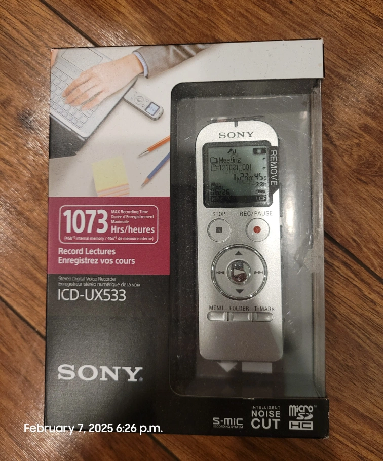 Portable digital voice recorder. Silver. Features intelligent noise cut playback. Includes accessories. High sensitivity and low noise. Expandable memory card slot. PC/Mac compatible.