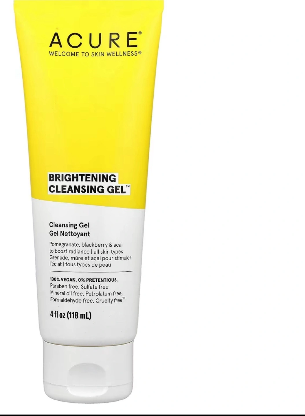 I'm selling a bottle of Acure Brightening Cleansing Gel. It's a 4 fl oz (118 mL) bottle. This cleansing gel contains pomegranate, blackberry, and acai to boost radiance for all skin types. It's also 100% vegan, paraben-free, sulfate-free, mineral oil-free, petrolatum-free, formaldehyde-free, and cruelty-free!