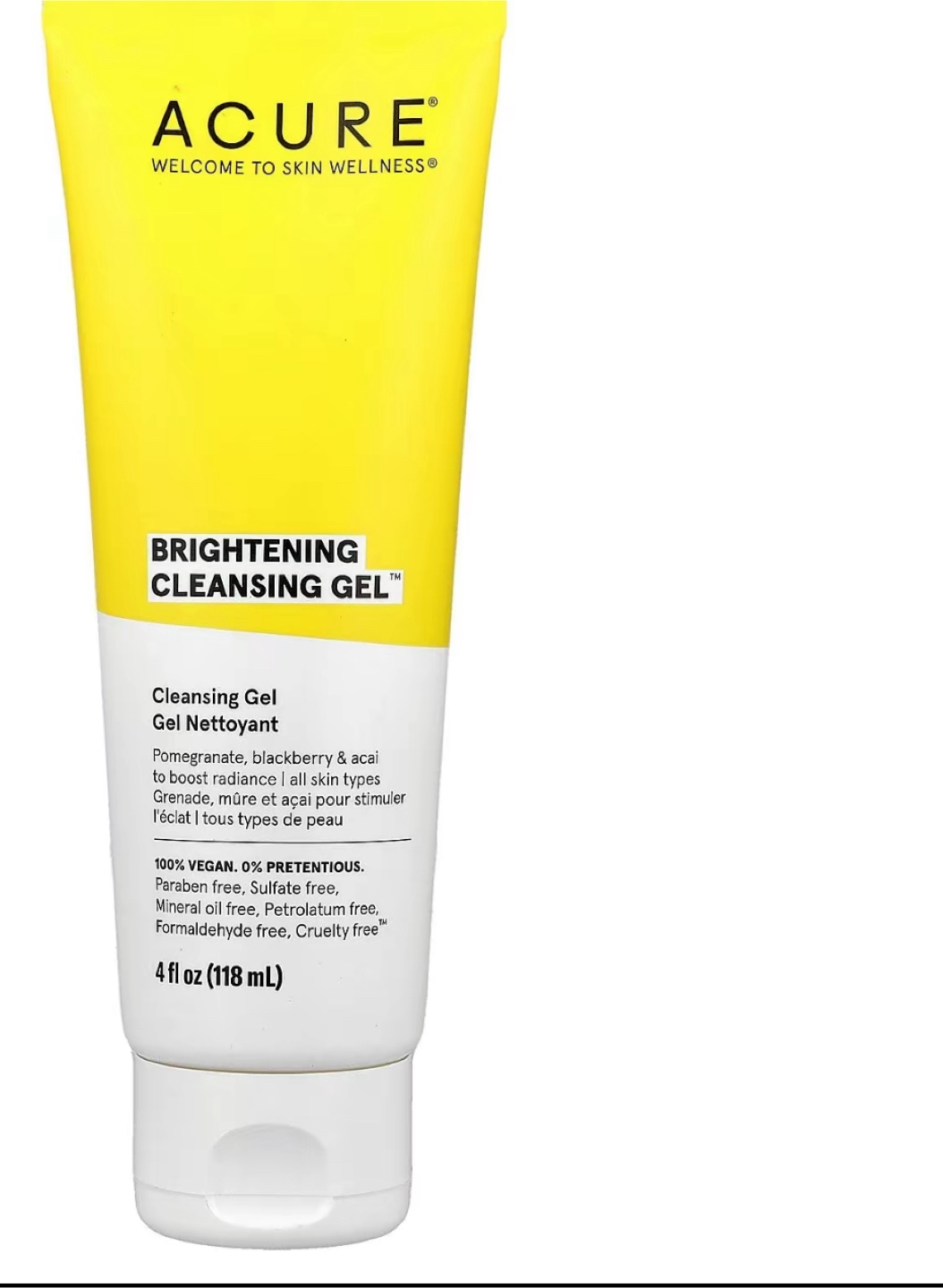 I'm selling a bottle of Acure Brightening Cleansing Gel. It's a 4 fl oz (118 mL) bottle. This cleansing gel contains pomegranate, blackberry, and acai to boost radiance for all skin types. It's also 100% vegan, paraben-free, sulfate-free, mineral oil-free, petrolatum-free, formaldehyde-free, and cruelty-free!