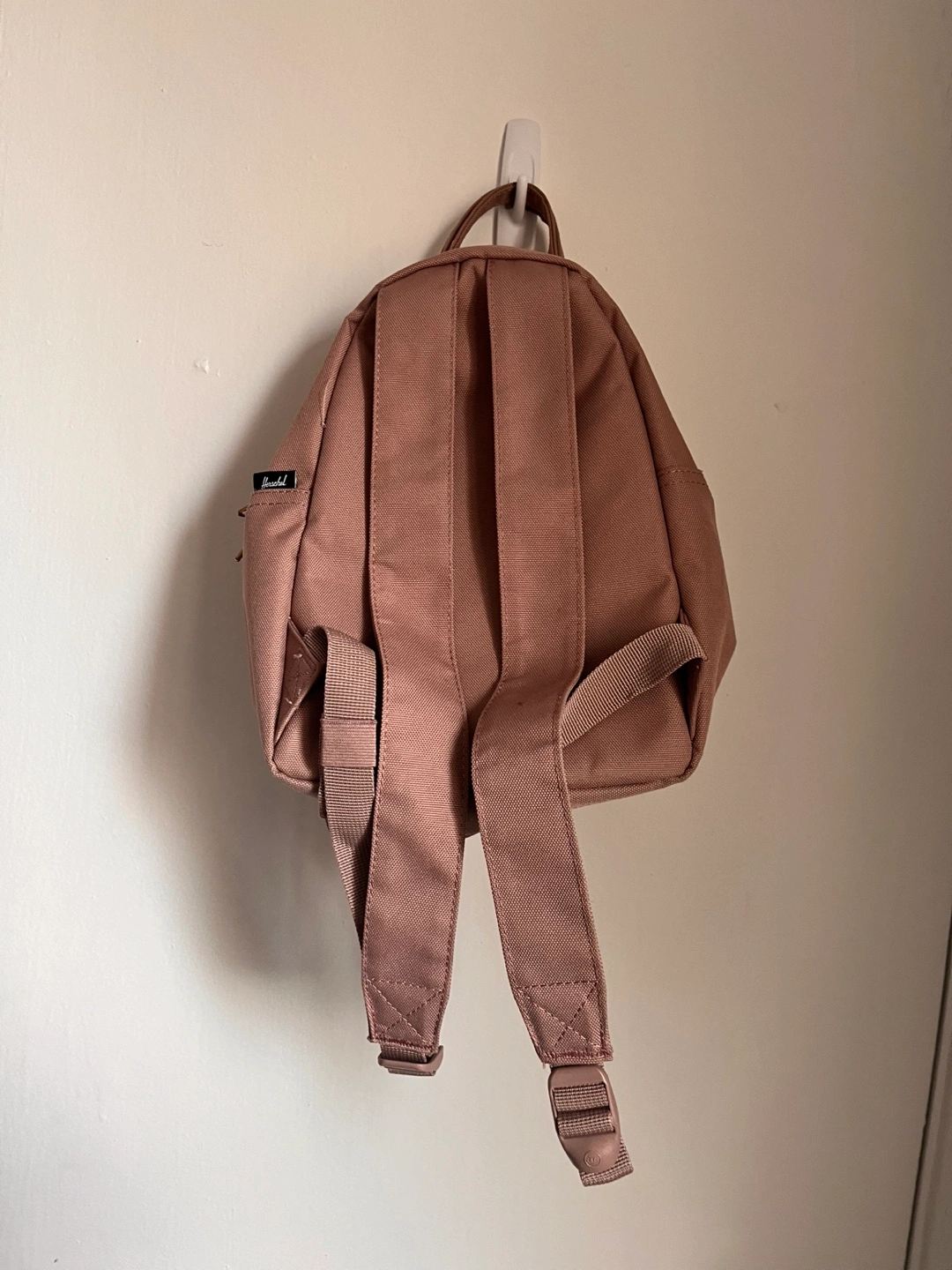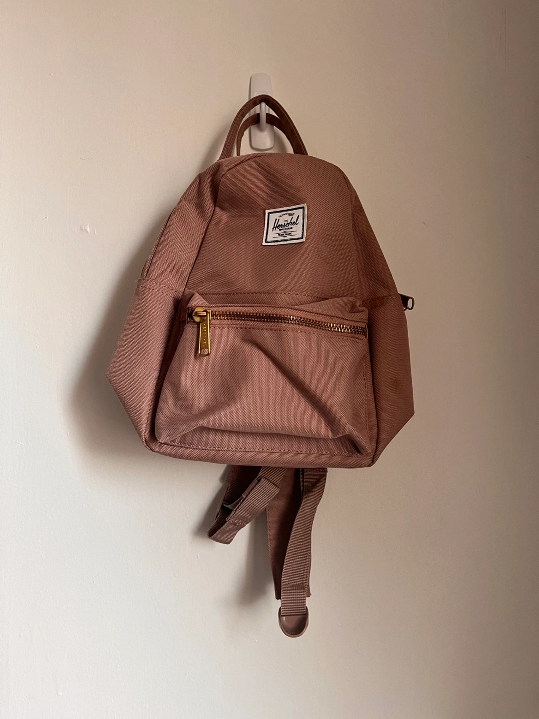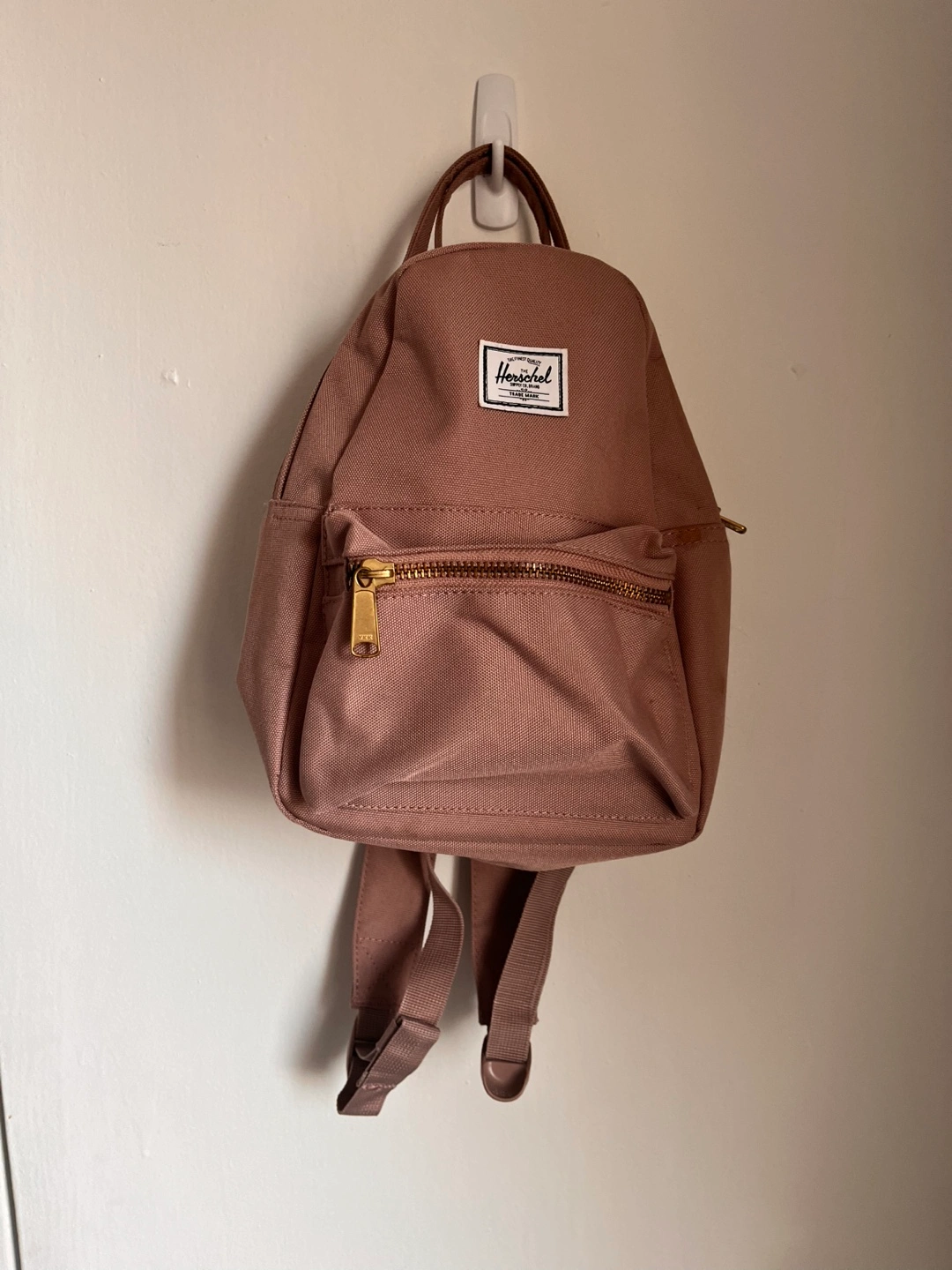 A small dusty pink backpack. Features a front zipper pocket and adjustable straps. The bag has a top handle for easy carrying.