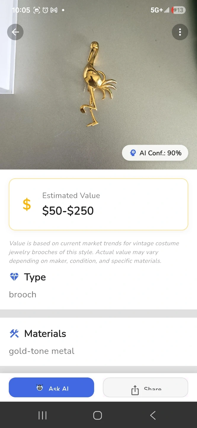 This is a gold-tone metal brooch shaped like a crane. It's a classic accessory for adding a touch of elegance to outfits. The material is gold-tone metal.