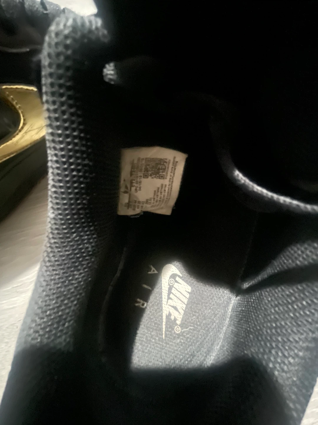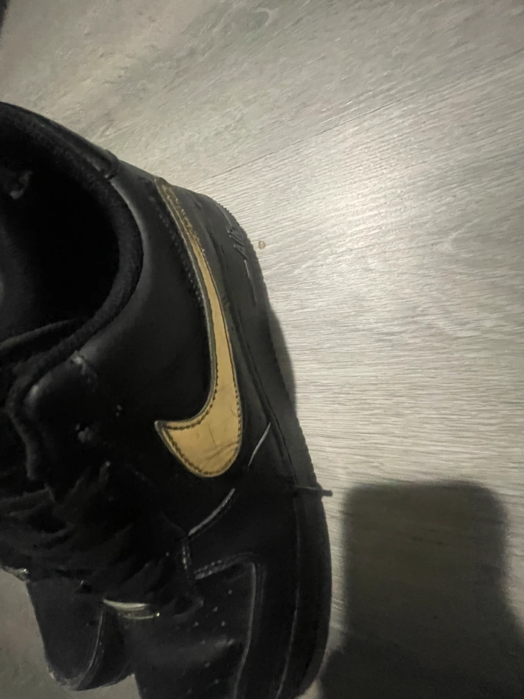 Selling a pair of Nike Air Force 1s in black with gold accents. They are used and show signs of wear, but still have lots of life left! Please see photos for condition(SEND ME YOUR BEST OFFER)