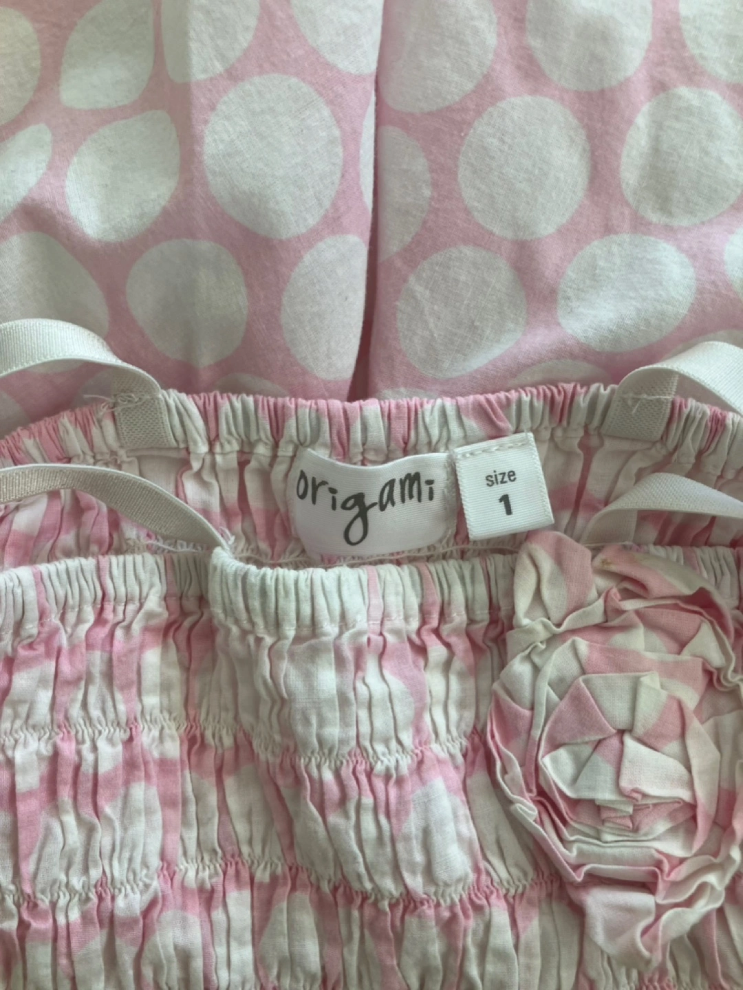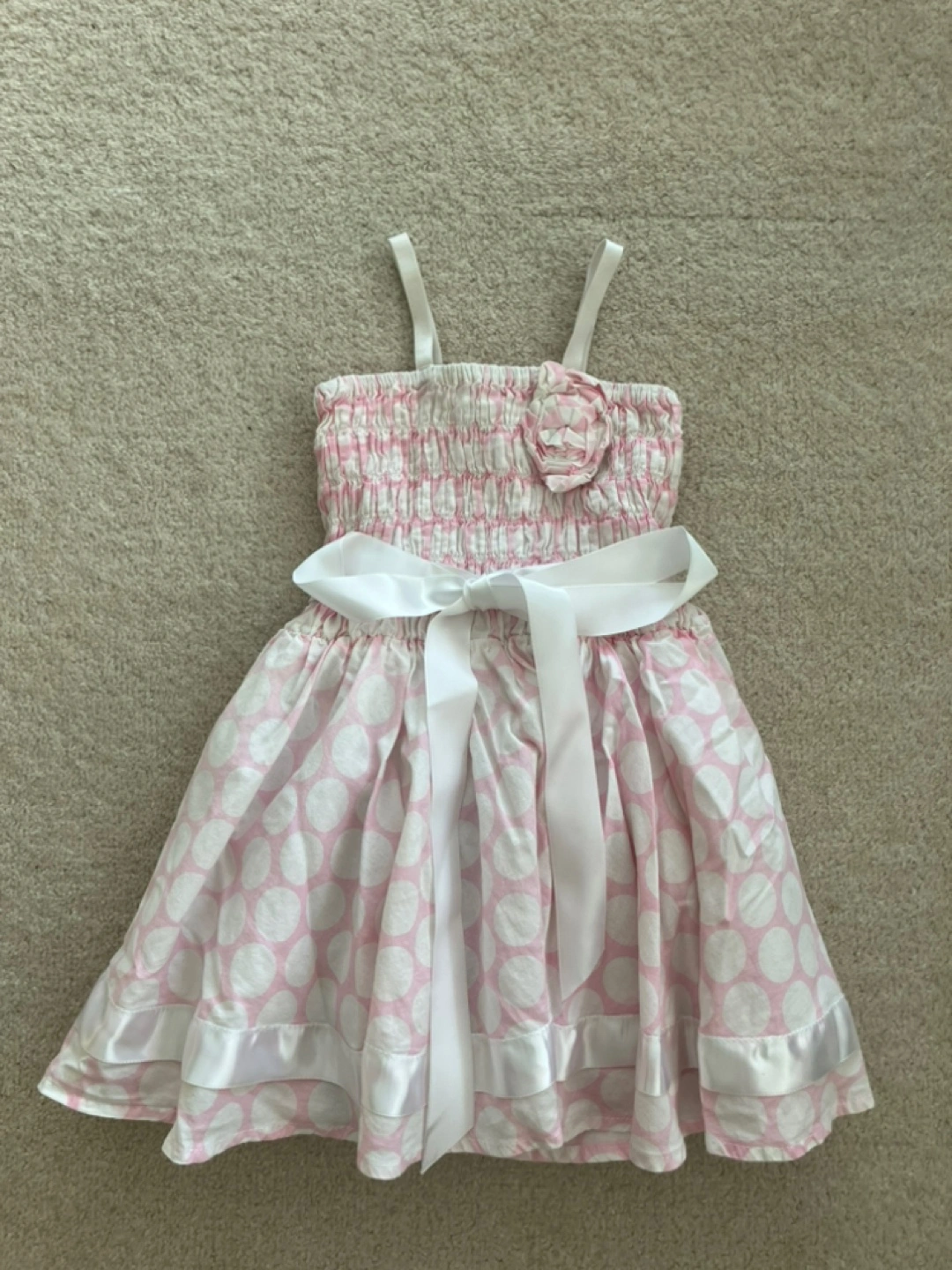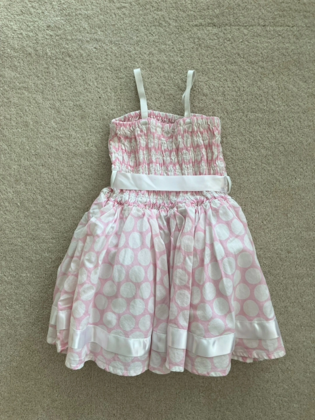 A cute summer party dress in pink and white. Perfect for a casual outing or a special occasion, this dress would make a lovely addition to your little one's wardrobe.