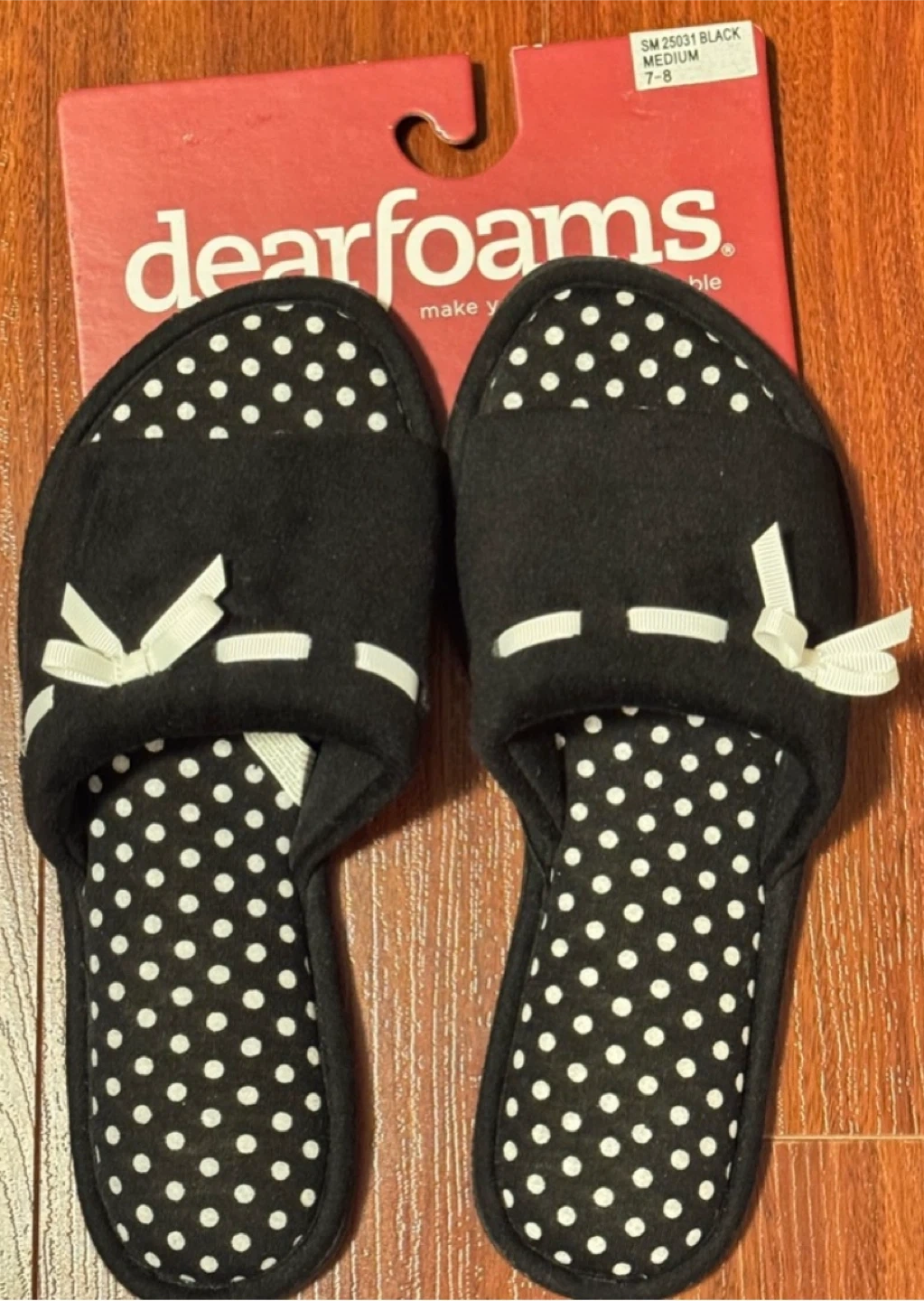 Cute pair of Dearfoams slippers in black with a white polka dot pattern and a little bow! They're a size medium (US 7-8). Super comfy and in great shape, ready to keep your feet cozy