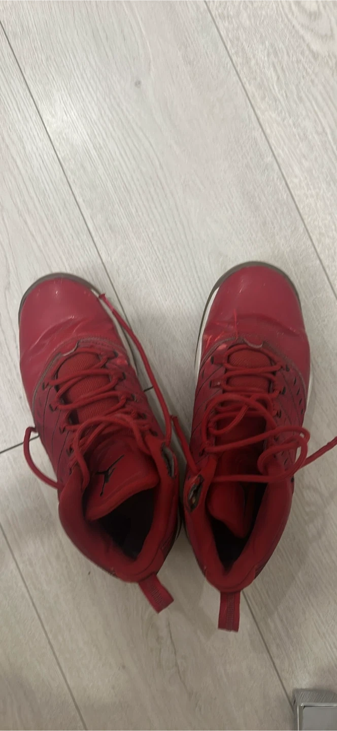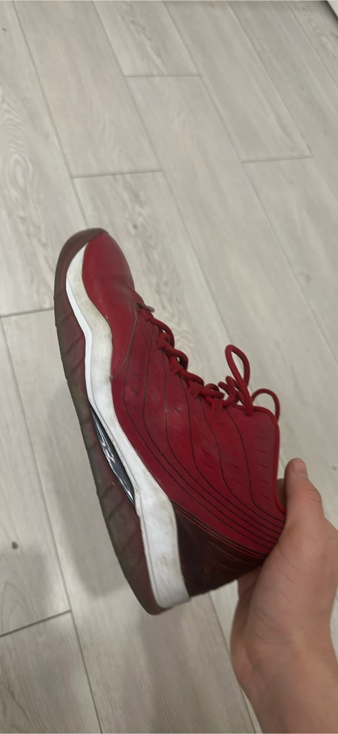These are red Air Jordan basketball shoes. They are a size 8 in US men's sizing, which is a 41 in European sizing. The shoes are made of leather and synthetic materials.