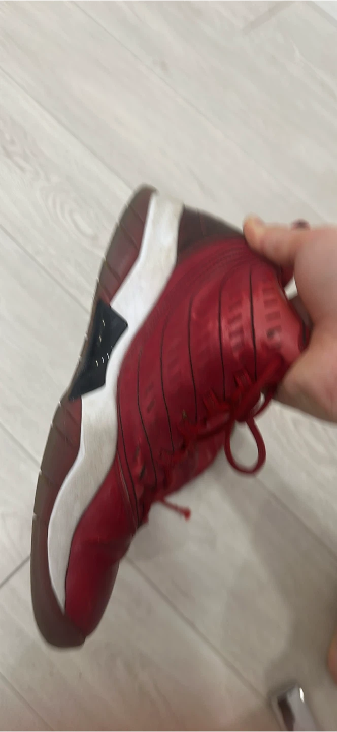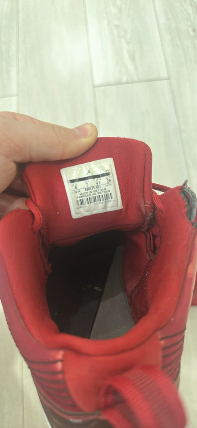 These are red Air Jordan basketball shoes. They are a size 8 in US men's sizing, which is a 41 in European sizing. The shoes are made of leather and synthetic materials.