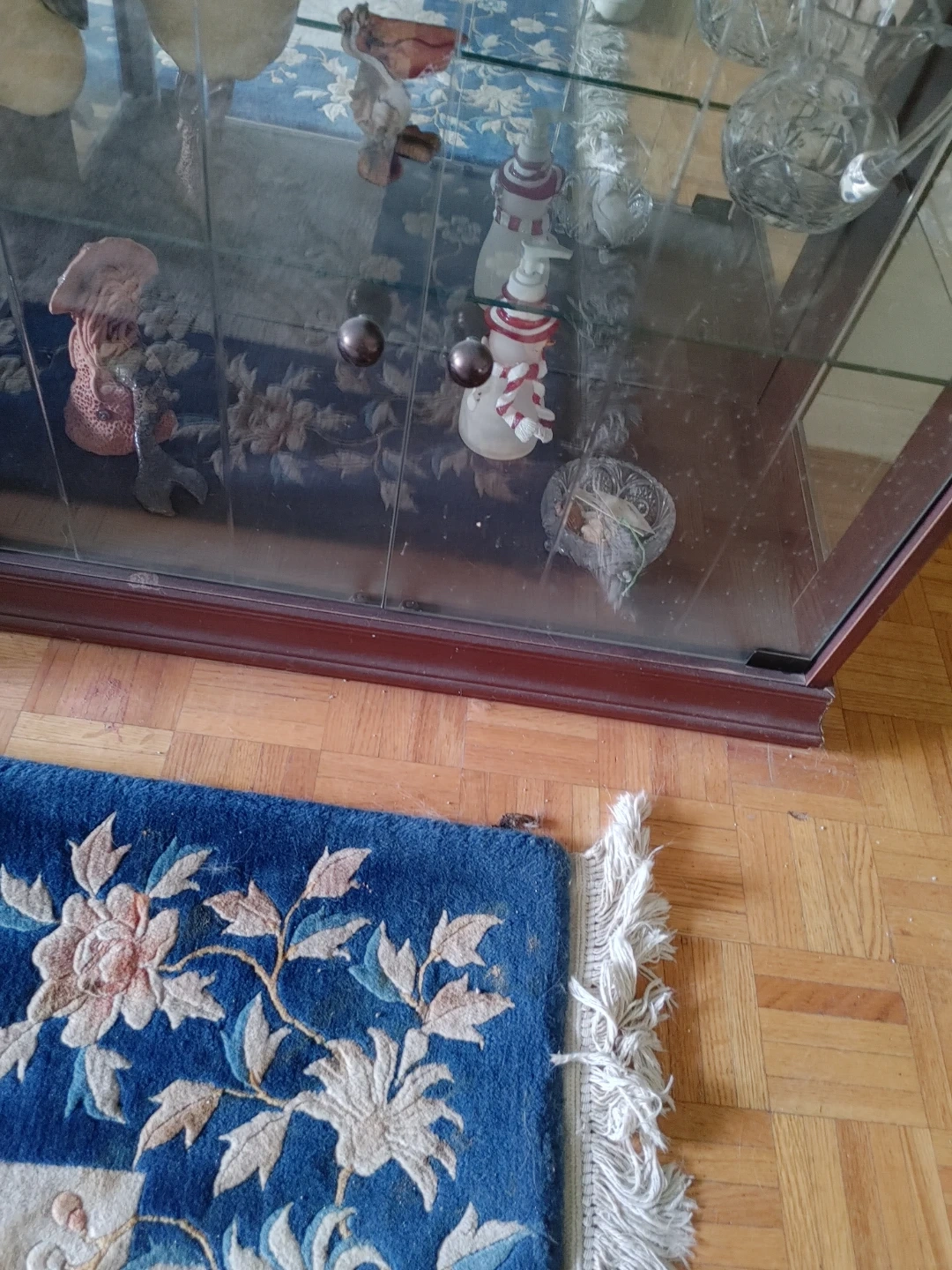 Tall glass display cabinet with a dark wood frame. It has multiple shelves for showcasing items and a lower cabinet section. Perfect for collectibles or decorative pieces!