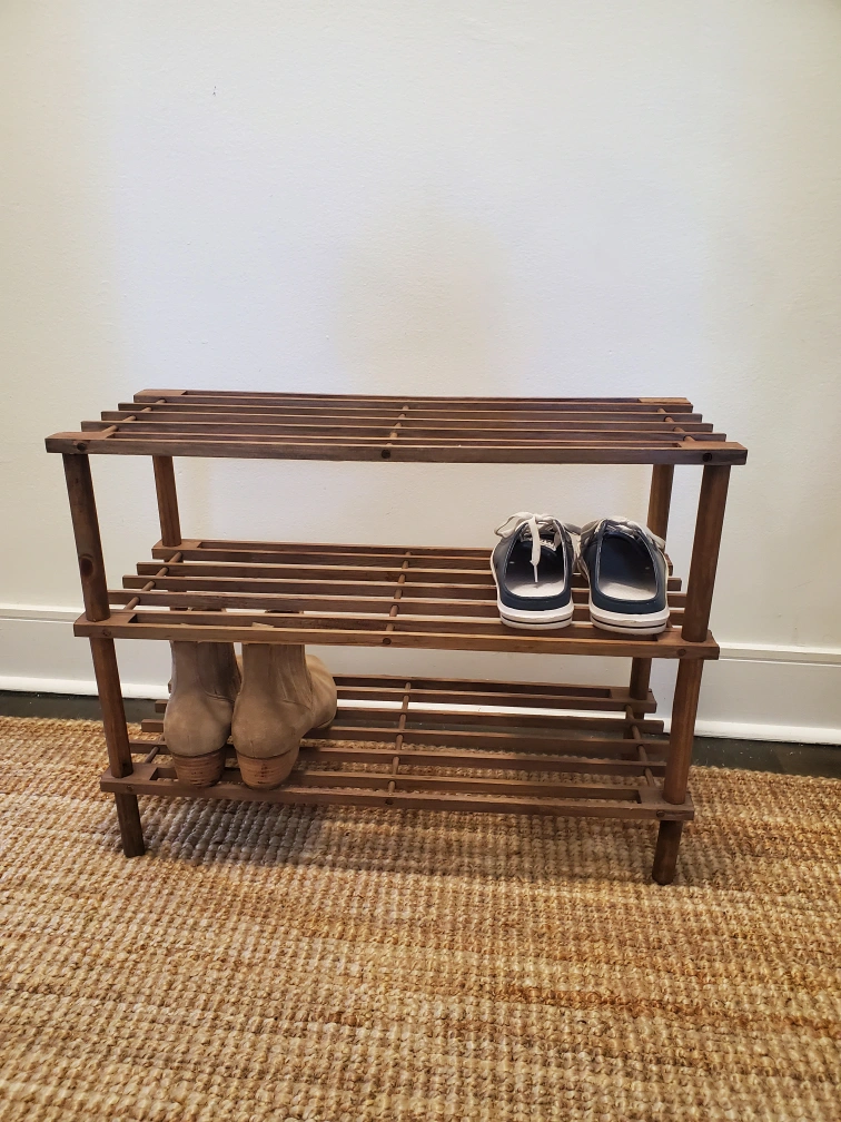 Selling a sturdy wooden shoe rack with three tiers. It's great for organizing your entryway or closet. The rack is in good condition and ready for a new home!