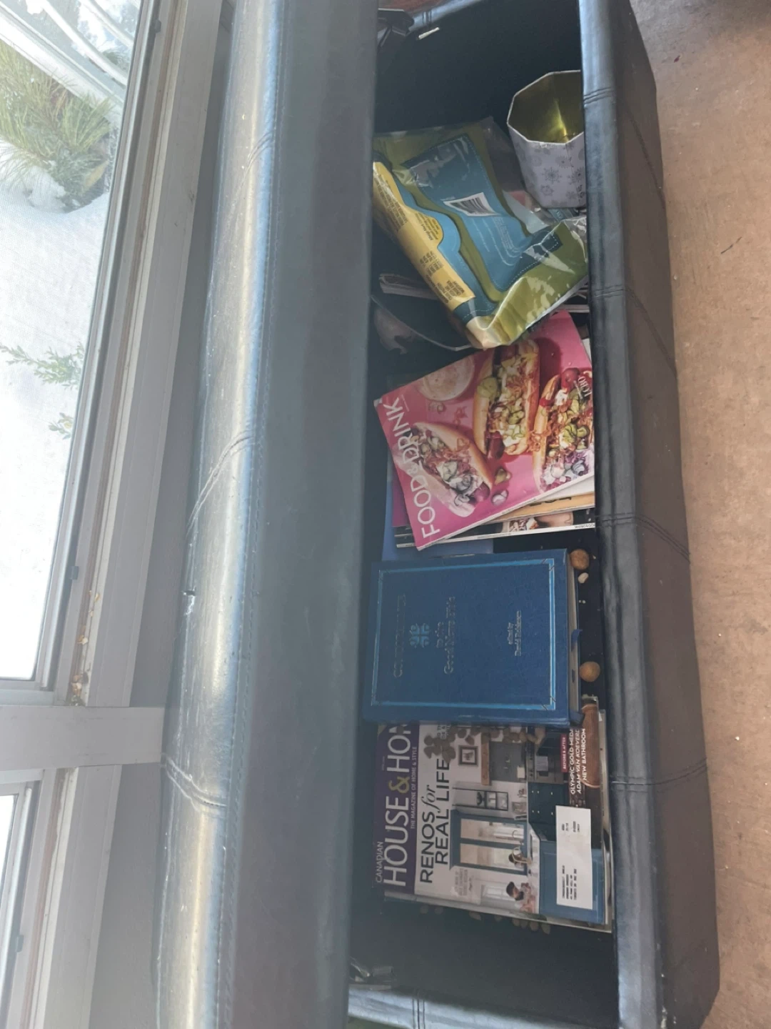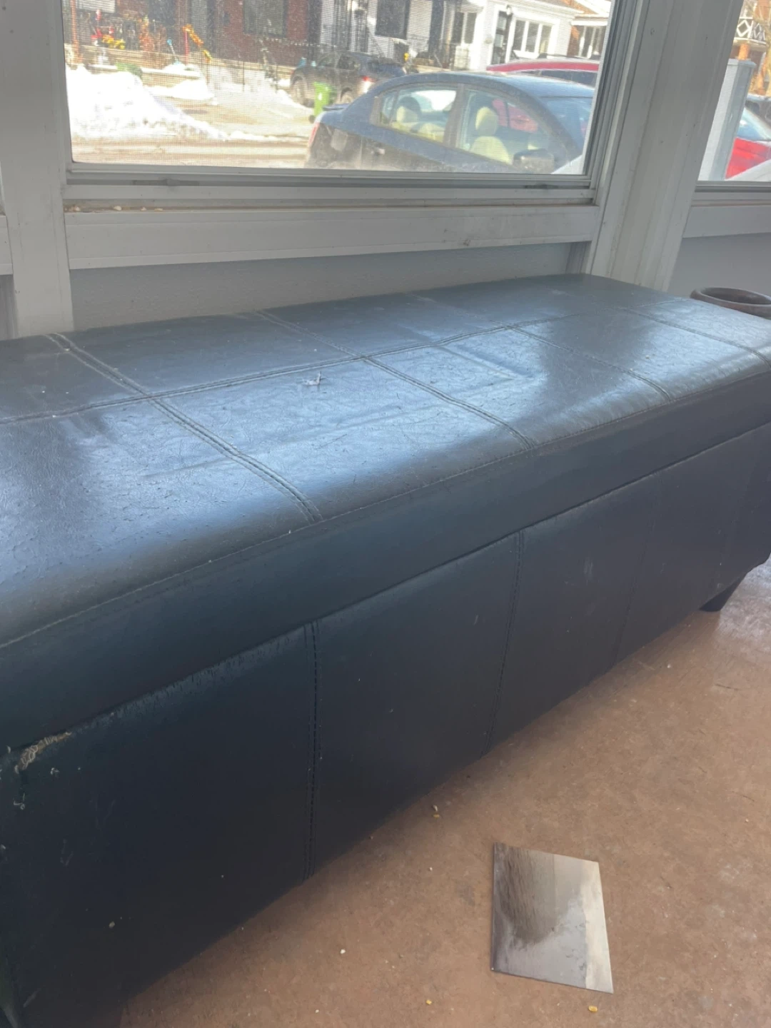 This faux leather storage ottoman bench is a versatile piece for your home. It opens up to reveal ample storage space inside. Perfect for stowing blankets, magazines, or other household items! Does have some wear but great for storage!