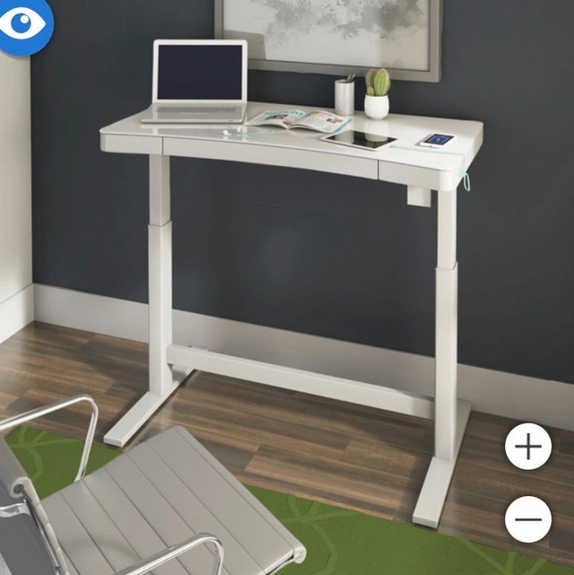 Check out this great Tresanti adjustable height sit/stand tech desk. This modern desk features a smooth, glass-top writing surface, and adjustable height allowing you to switch between sitting and standing positions effortlessly. It includes integrated technology such as a wireless charging pad and USB ports for convenient device charging. It also has a built in drawer!