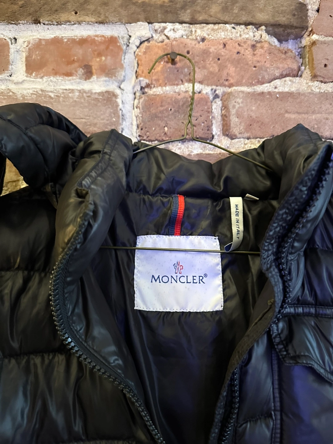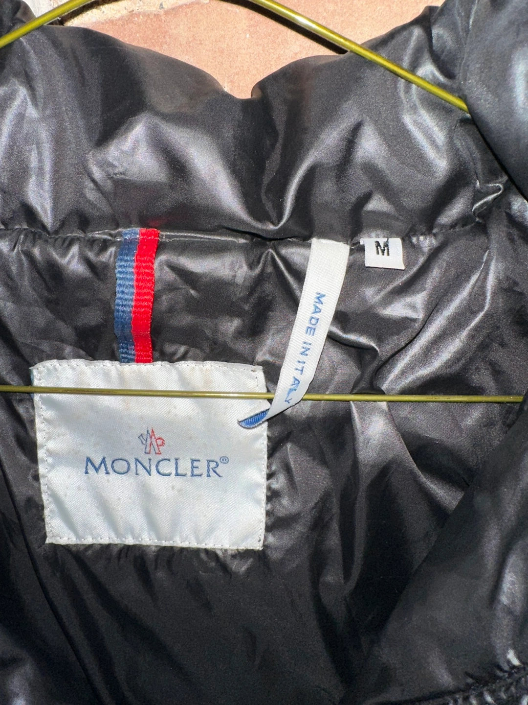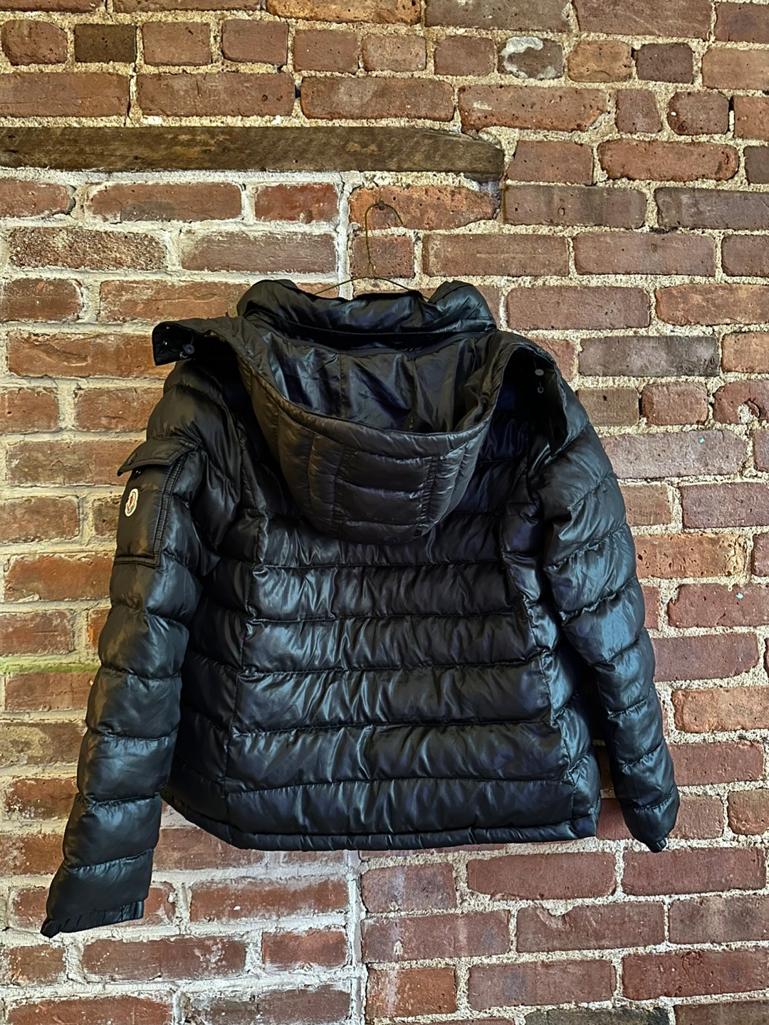Black puffer jacket with a hood. Zipper closure with snap buttons. Two front pockets. Inside pocket. Made in Italy.