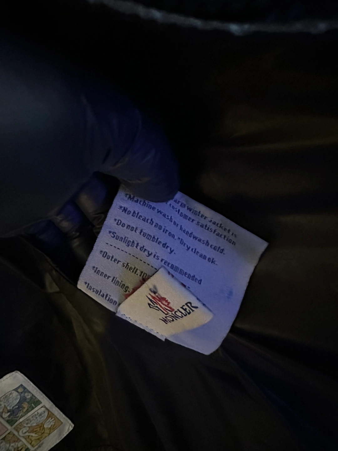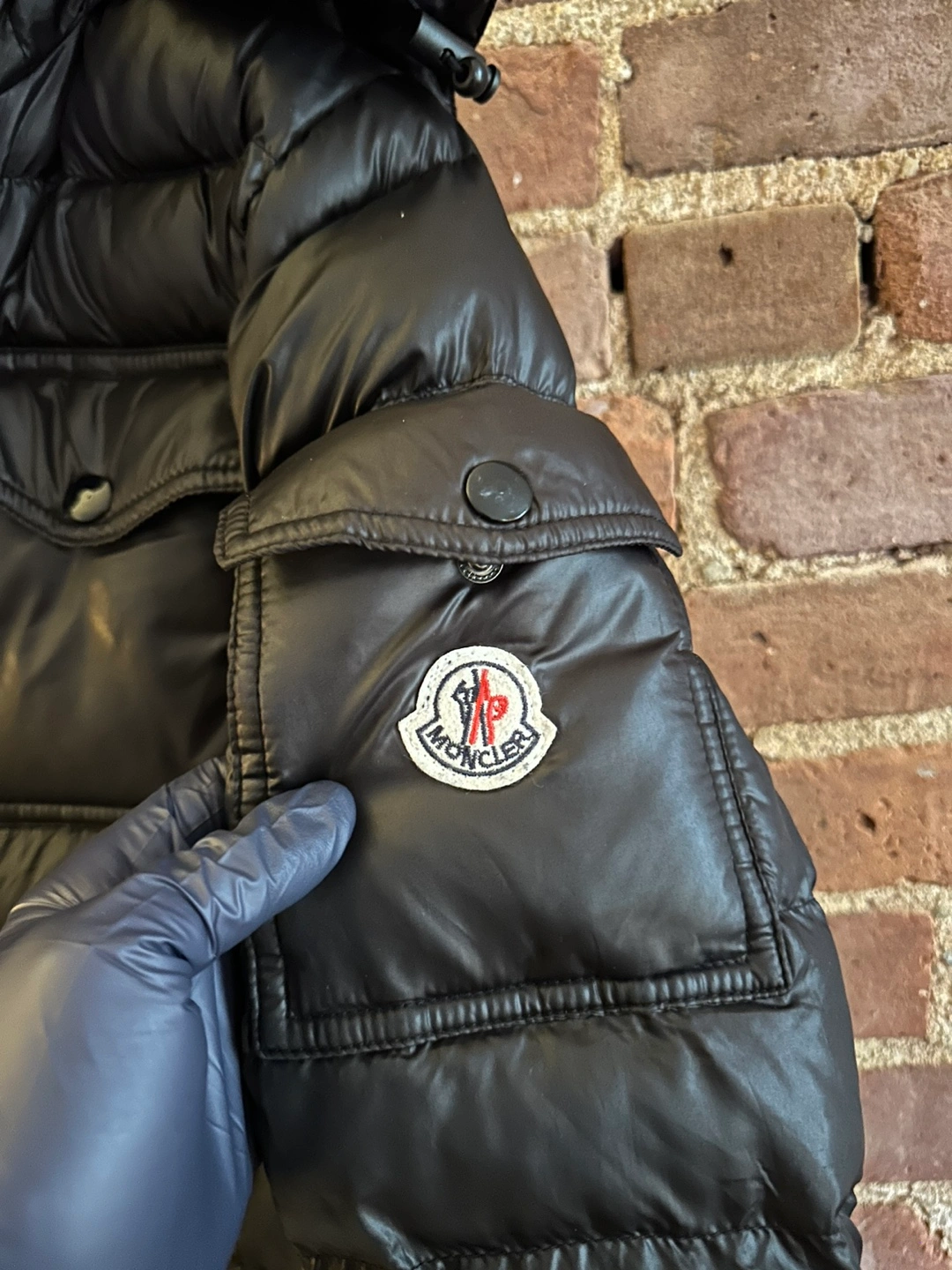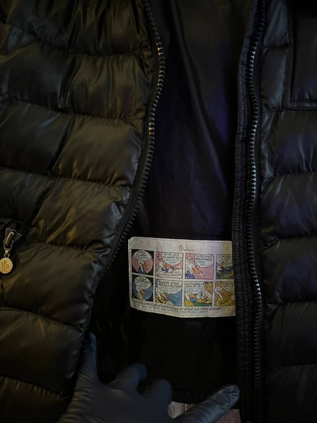 Black puffer jacket with a hood. Zipper closure with snap buttons. Two front pockets. Inside pocket. Made in Italy.