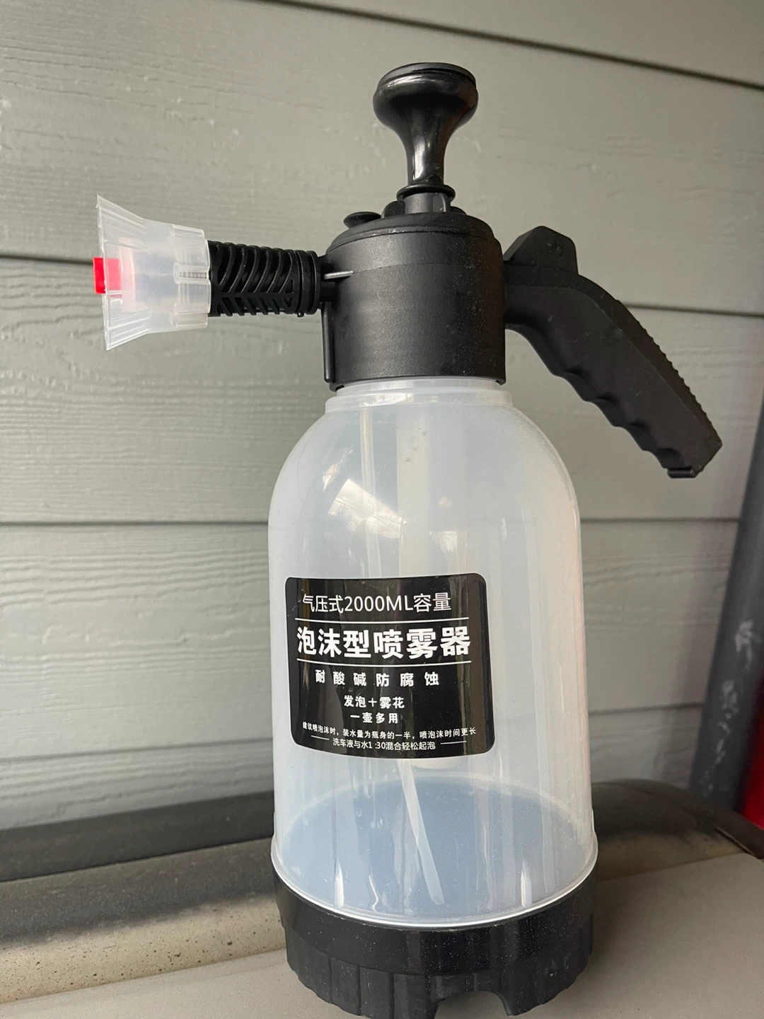 This is a pressurized foam sprayer with a 2000ML capacity. It's designed to be acid and alkali resistant, making it suitable for various cleaning tasks. It can be used for foaming or spraying mist. Great for car washing or other cleaning jobs!