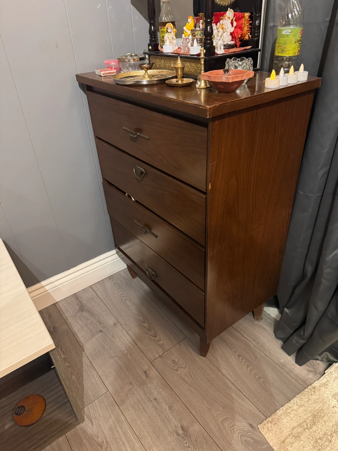 This vintage chest of drawers is made from dark wood. It features four drawers with metal handles. Provides ample storage space for your belongings.