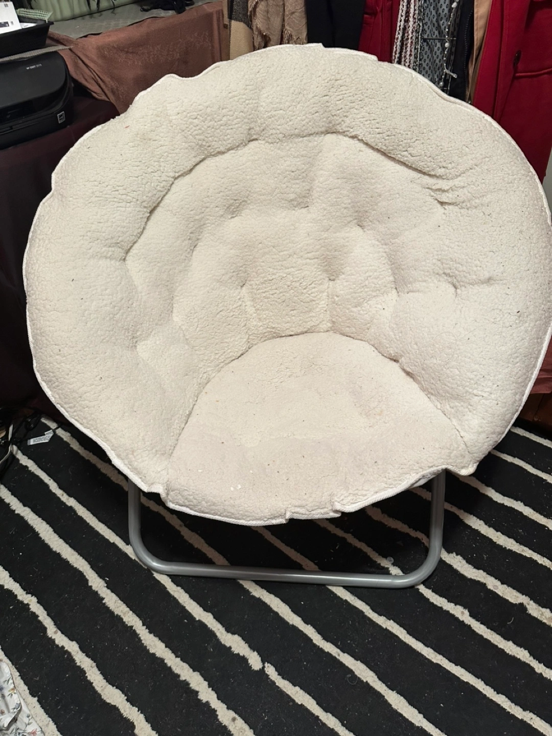 Selling a comfy papasan chair! It's in great shape and would be a perfect addition to any room. The cushion is a soft cream colour and the frame is sturdy. It's super cozy for reading or just relaxing at home