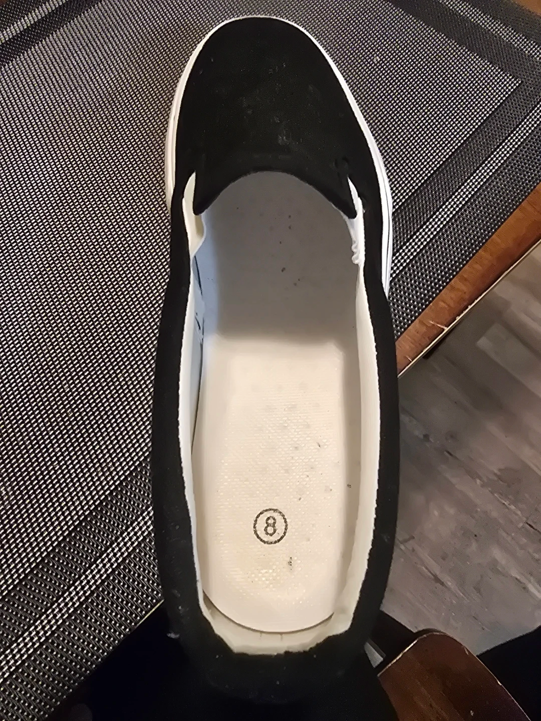 Classic black slip-on sneakers with white soles. Featuring a durable rubber outsole and a comfortable interior. Size 8 women's.