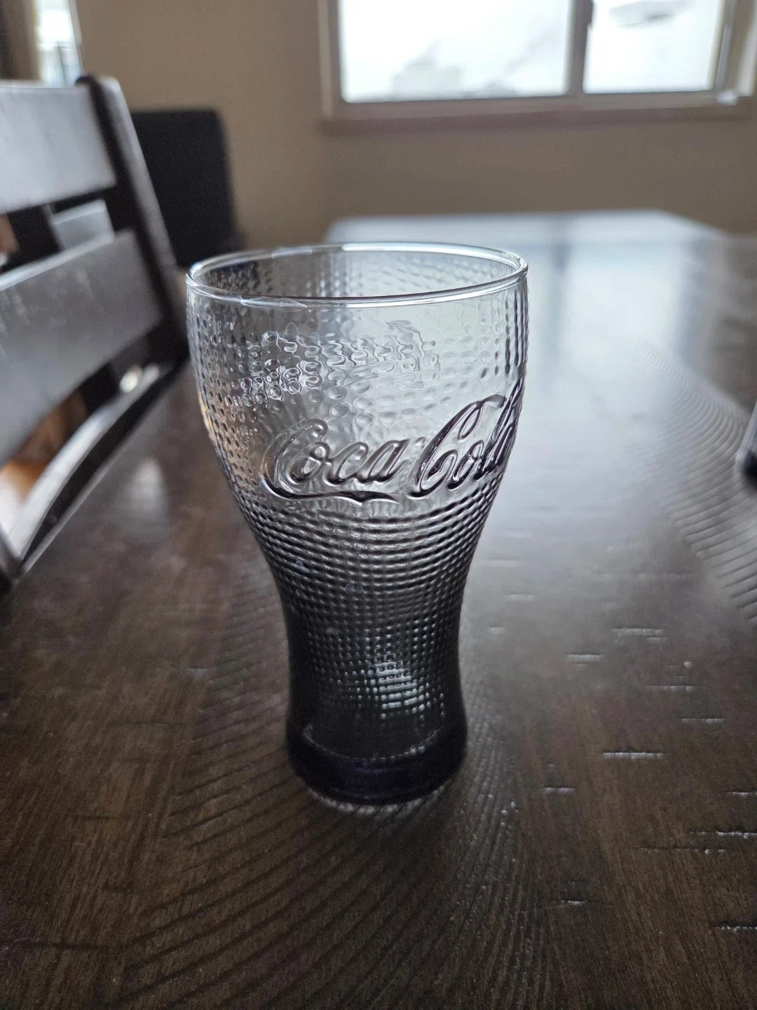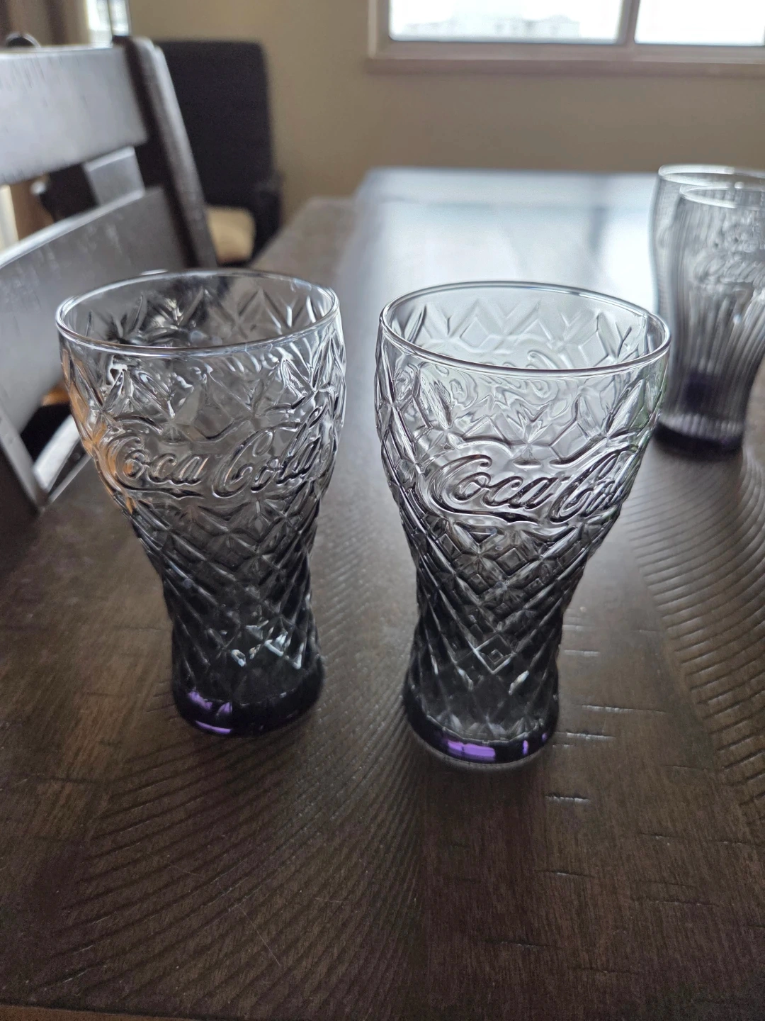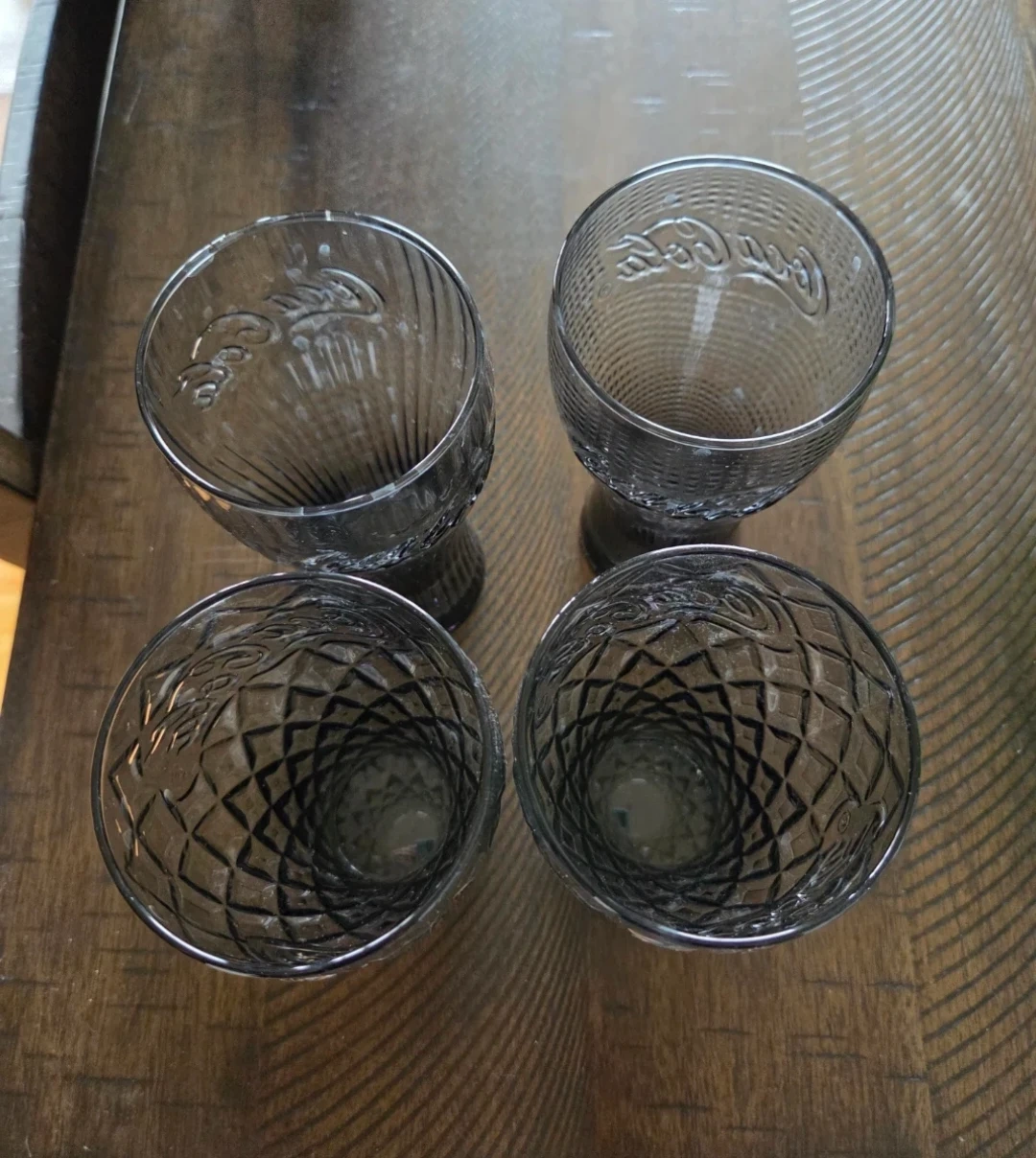 Set of four Coca-Cola themed glasses. Features three different embossed designs with the iconic Coca-Cola logo. Two of the glasses are the same design and the other two are different. They have a slight navy tint to them. Perfect for enjoying your favourite beverages!