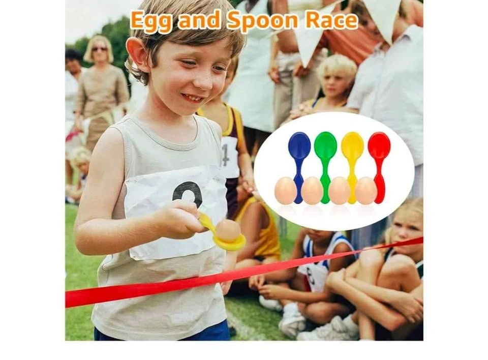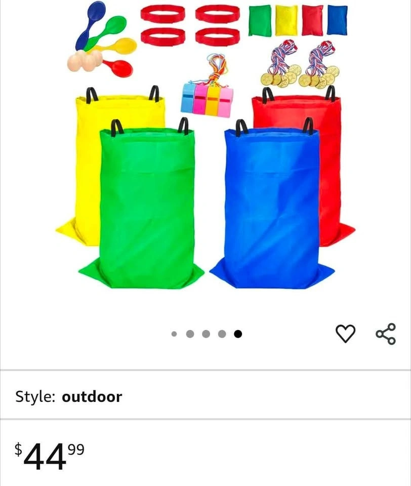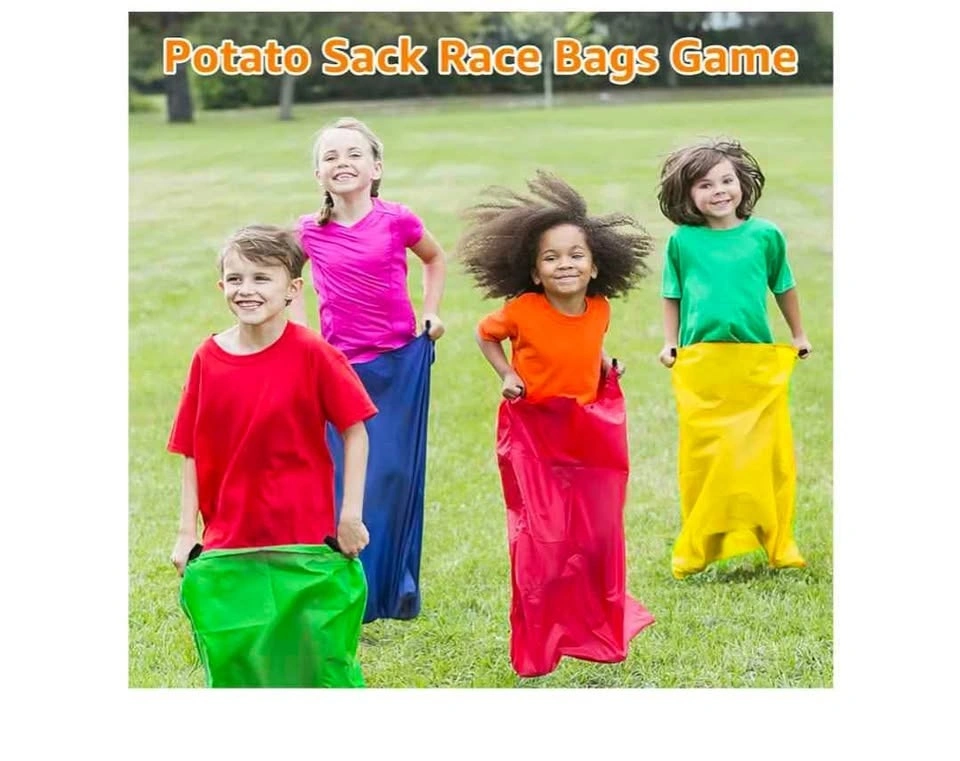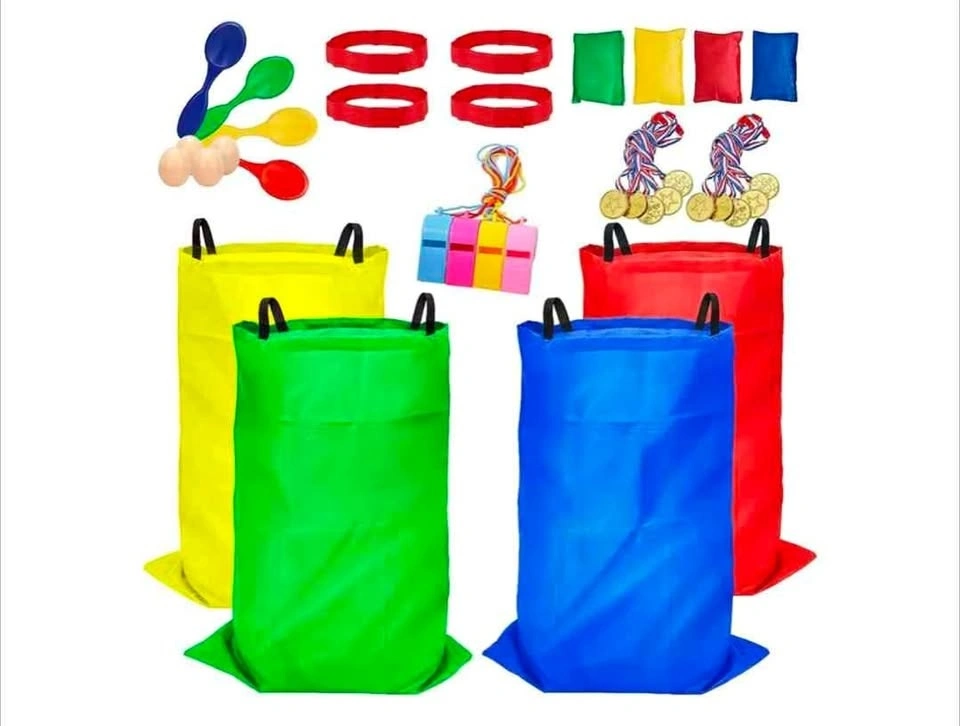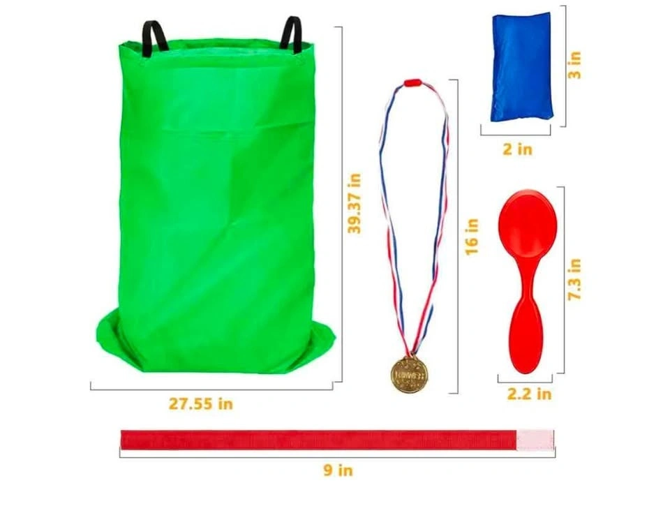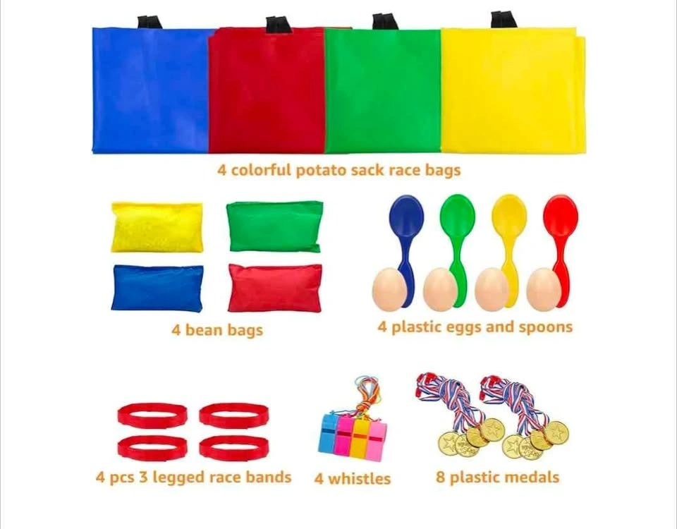 Brand new. Includes potato sack race, bean bag toss games, 3 legged race bands, egg spoon relay race, medals, and more. Perfect for outdoor fun! Final sale.