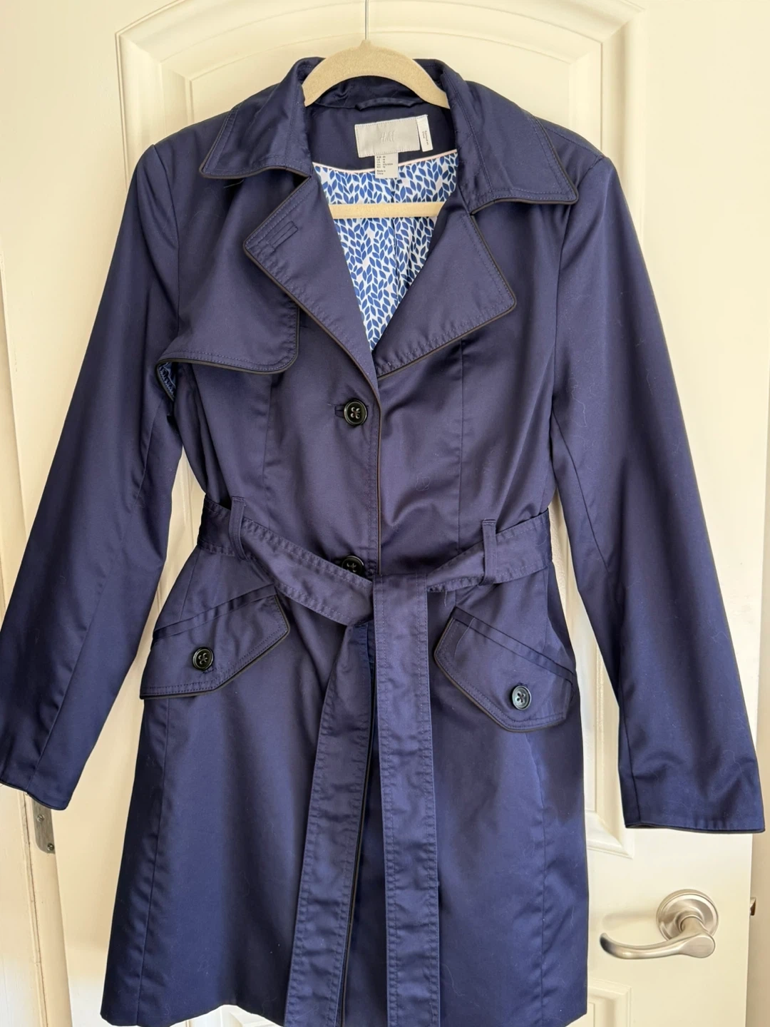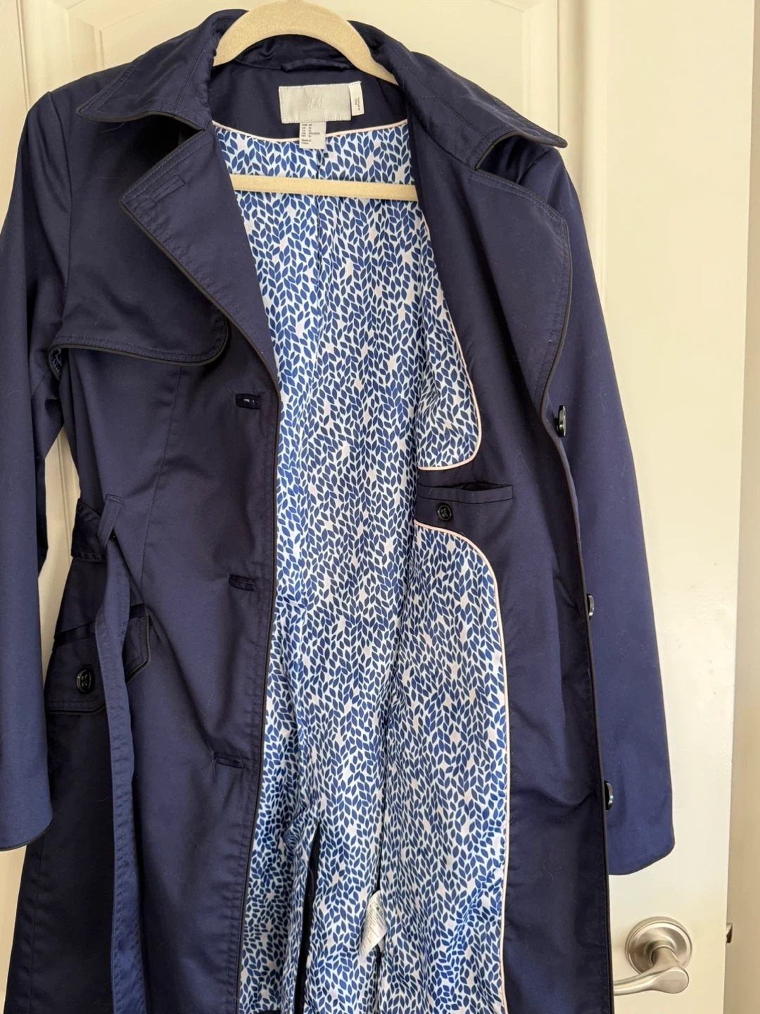 Buy & SellH&M Navy Trench Coat with Blue Leaf LiningH&M Navy Trench Coat with Blue Leaf Lining$25A classic navy trench coat from H&M. It features a vibrant blue leaf-patterned lining and a matching belt. Great for transitional weather!ConditionLike newSize14BrandH&MWHERE TO MEETPort CoquitlamView MapSELLERverifiedNataliePort Coquitlam650 reviews0 chats·0 favorites·4 viewsSEND CHAT TO SELLERHi Natalie! I’m interested in your listing.Hi Natalie! I’m interested in your listing.Get the Karrot app to chatSign In to chat