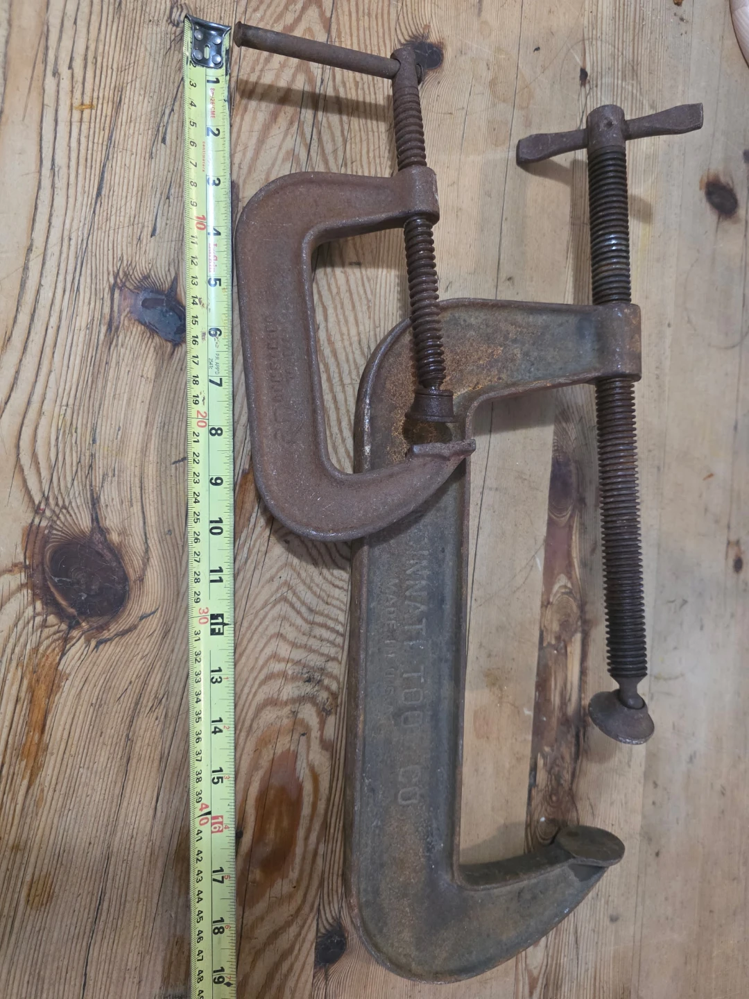 Two vintage C-clamps are shown here. One is larger than the other. They appear to be made of metal. The larger one has 'CINCINNATI TOOL CO MADE IN US' imprinted on the side. These are handy for woodworking or general repairs!