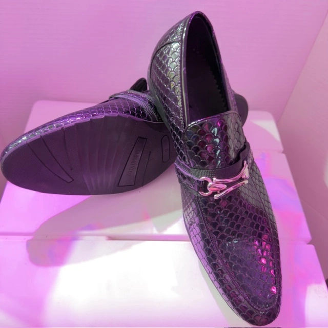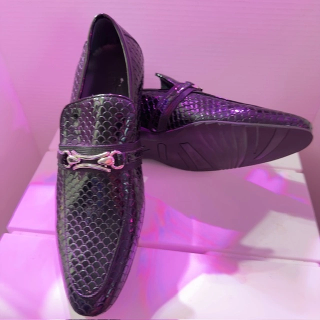 These black dress loafers are perfect for a night out or a business casual event. They have a unique textured pattern and a silver-tone accent. They are in great condition and ready for a new home!