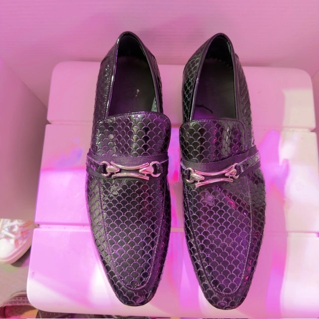 These black dress loafers are perfect for a night out or a business casual event. They have a unique textured pattern and a silver-tone accent. They are in great condition and ready for a new home!