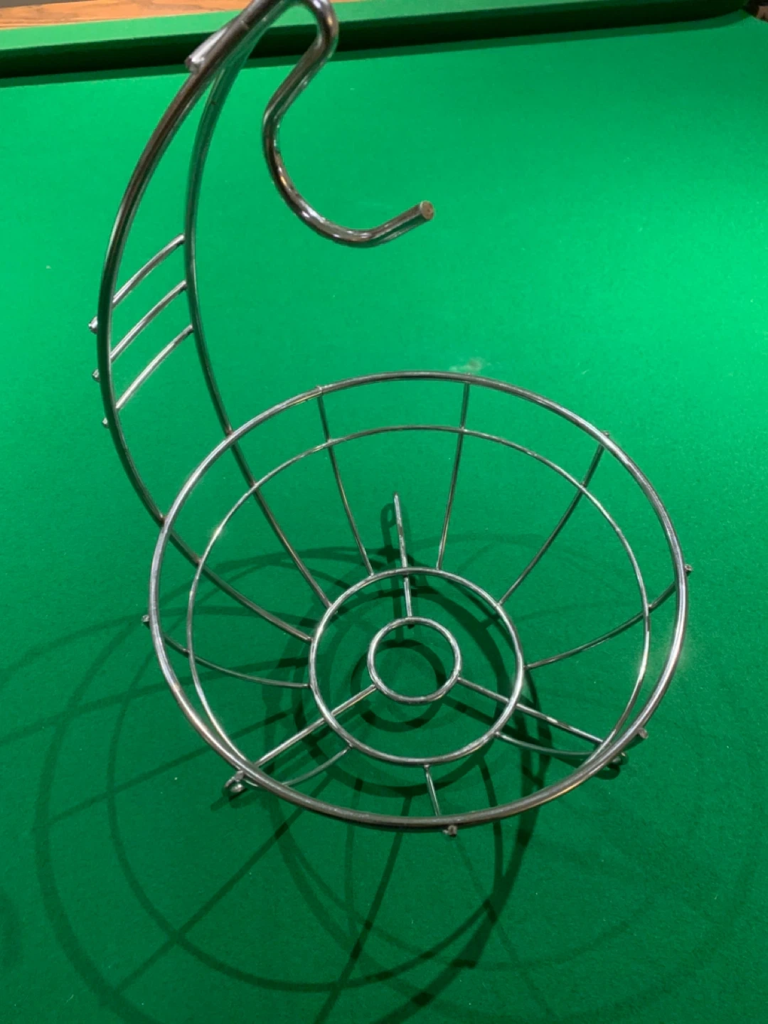 Here's a chrome fruit basket with a handy banana hook! It's perfect for keeping your fruit organized and easily accessible on your countertop. The chrome finish gives it a sleek and modern look that will complement any kitchen decor