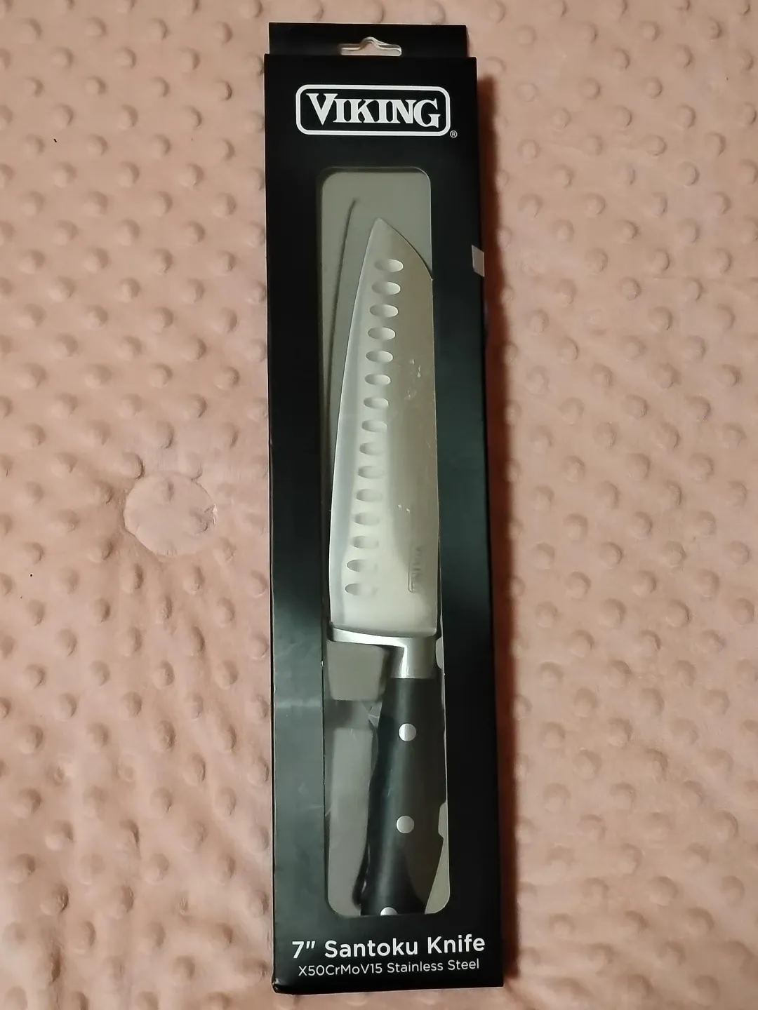 I'm selling a brand new Viking 7" Santoku Knife. It is still in its original packaging. The blade is made of X50CrMoV15 Stainless Steel