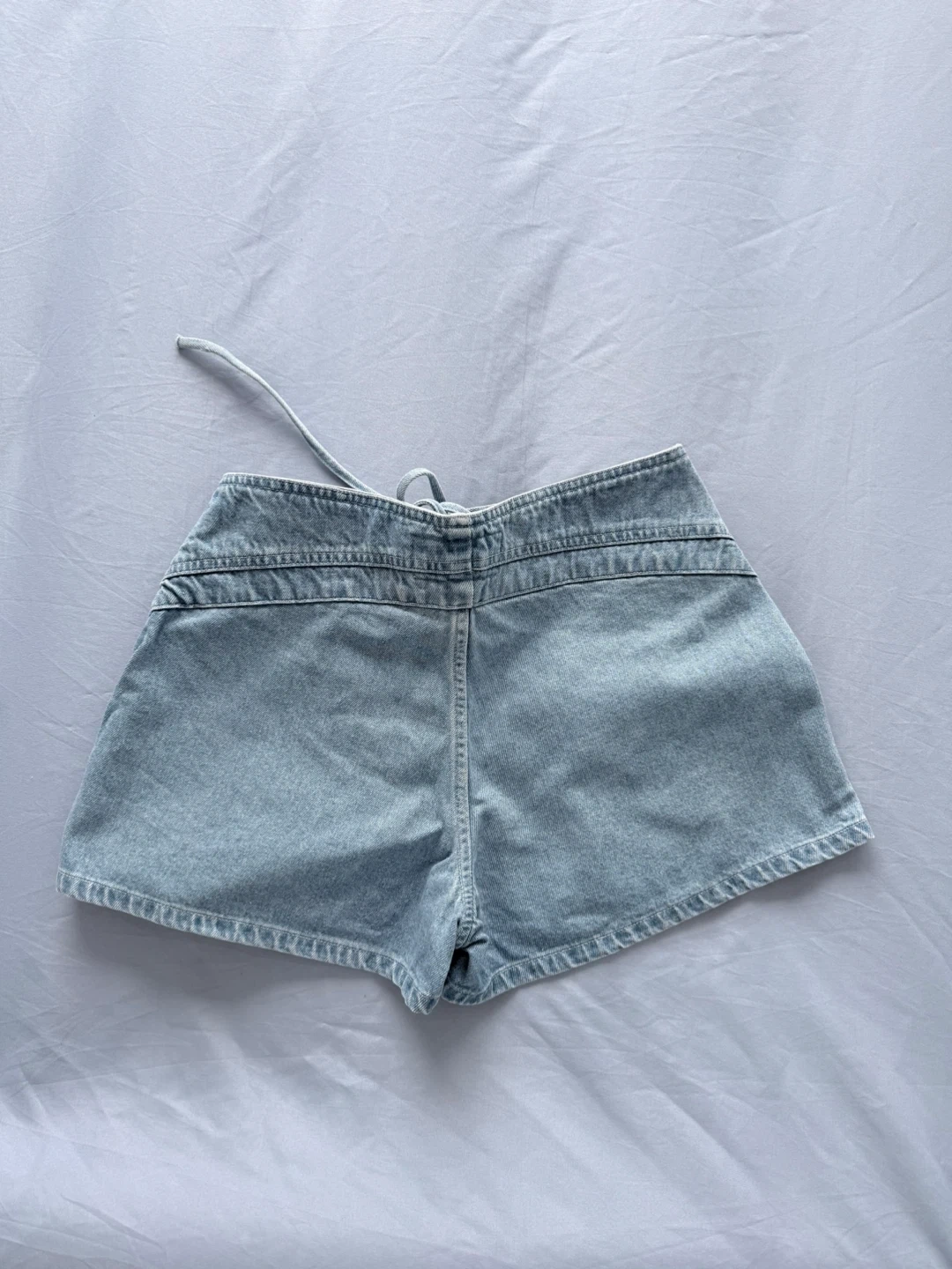 Light wash denim shorts featuring a tie-waist closure. These shorts have a classic five-pocket design. Denim material.