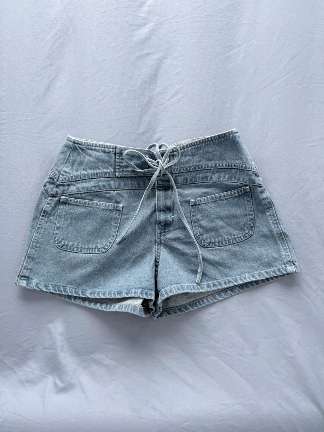 Light wash denim shorts featuring a tie-waist closure. These shorts have a classic five-pocket design. Denim material.