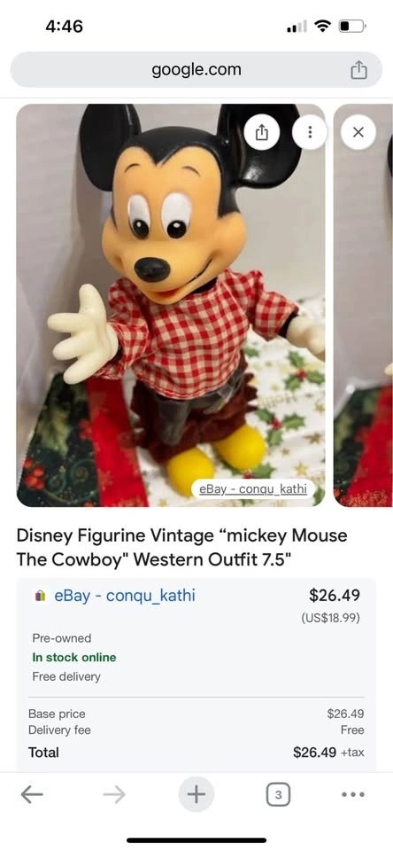 Buy & SellVintage Cowboy Mickey MouseVintage Cowboy Mickey Mouse$15This is a vintage Cowboy Mickey Mouse with all pieces and the complete outfit. The arms and legs are movable. Great for a Mickey collector too.WHERE TO MEETCheck LocationView MapSELLERverifiedLindaWhitevale650 reviews0 chats·0 favorites·1 viewsSEND CHAT TO SELLERHi Linda! I’m interested in your listing.Hi Linda! I’m interested in your listing.Get the Karrot app to chatSign In to chat