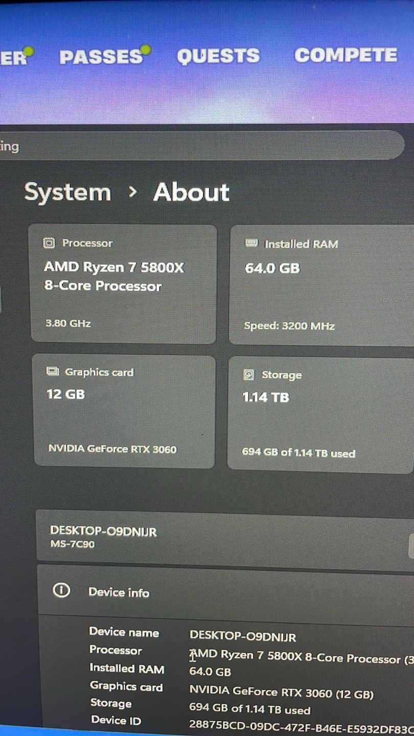 Specs: Ryzen 7 5800x with a 3060 12gb oc, 64gb or ram ,1tb msi ssd , liquid cooler