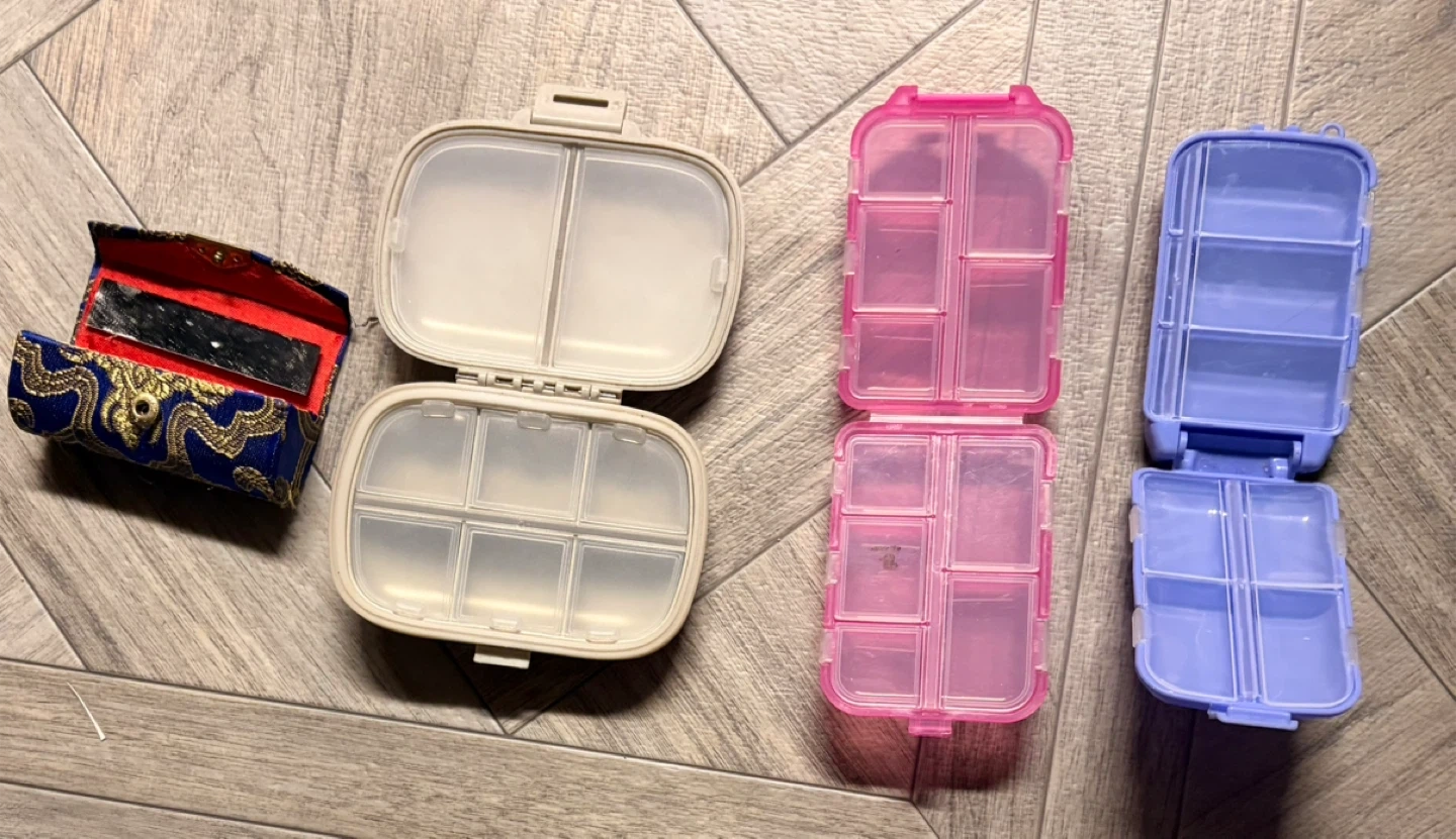 Three portable pill cases in beige, pink, and purple. 1 lipstick case w/mirror all perfect for travel or on-the-go organization. Keep your medication or small items secure! Each $5.00