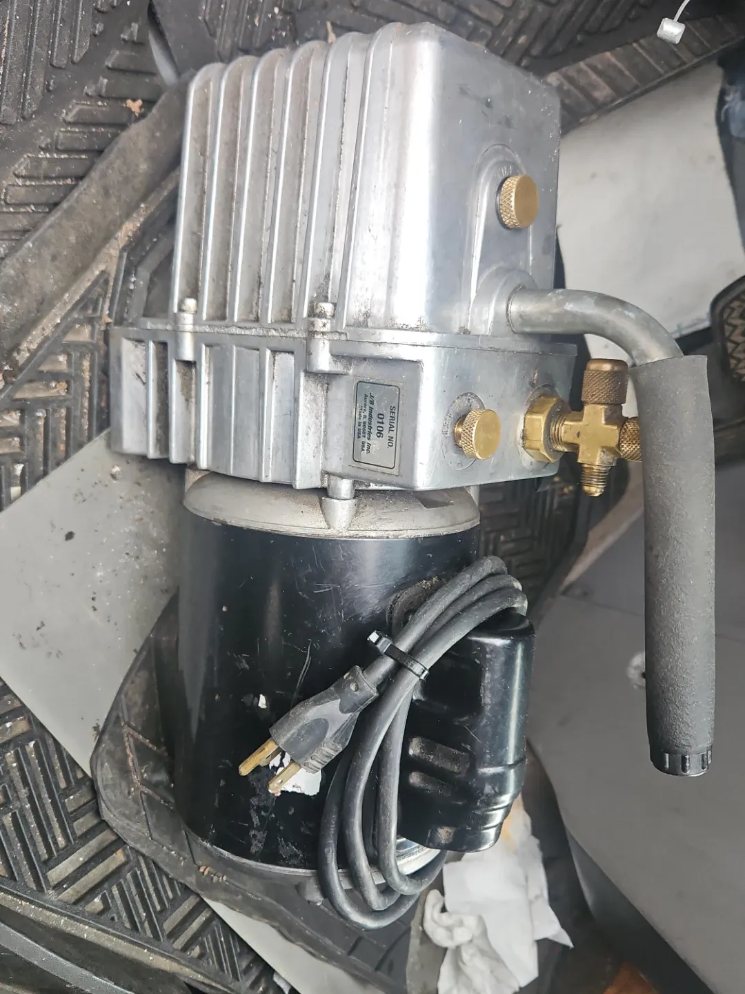 J/B Industries Inc. vacuum pump. Model 0106. Cast aluminium casing and black motor. Includes power cord and hose attachment. This pump is suitable for HVAC and refrigeration work.