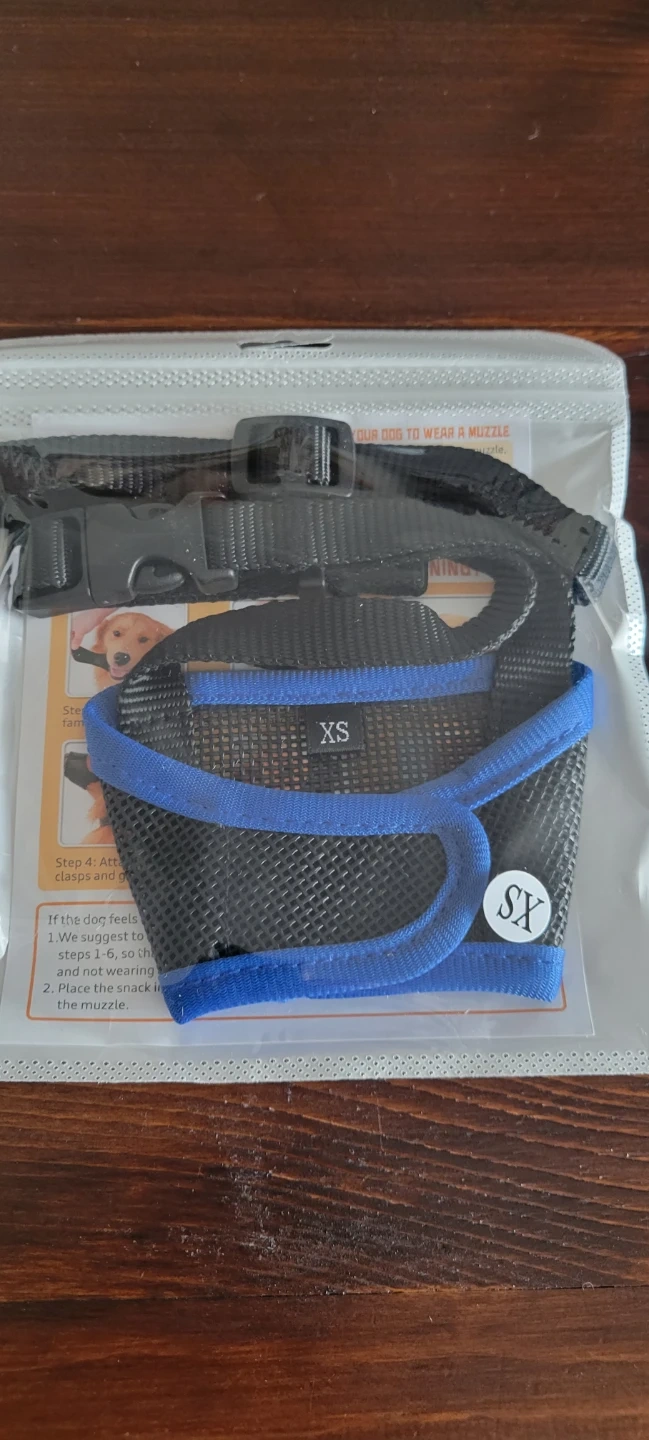 This brand new, sealed soft dog muzzle is made of breathable mesh material. It features an adjustable strap and buckle for a secure fit. It's designed to prevent biting and barking. This muzzle is suitable for small dogs.