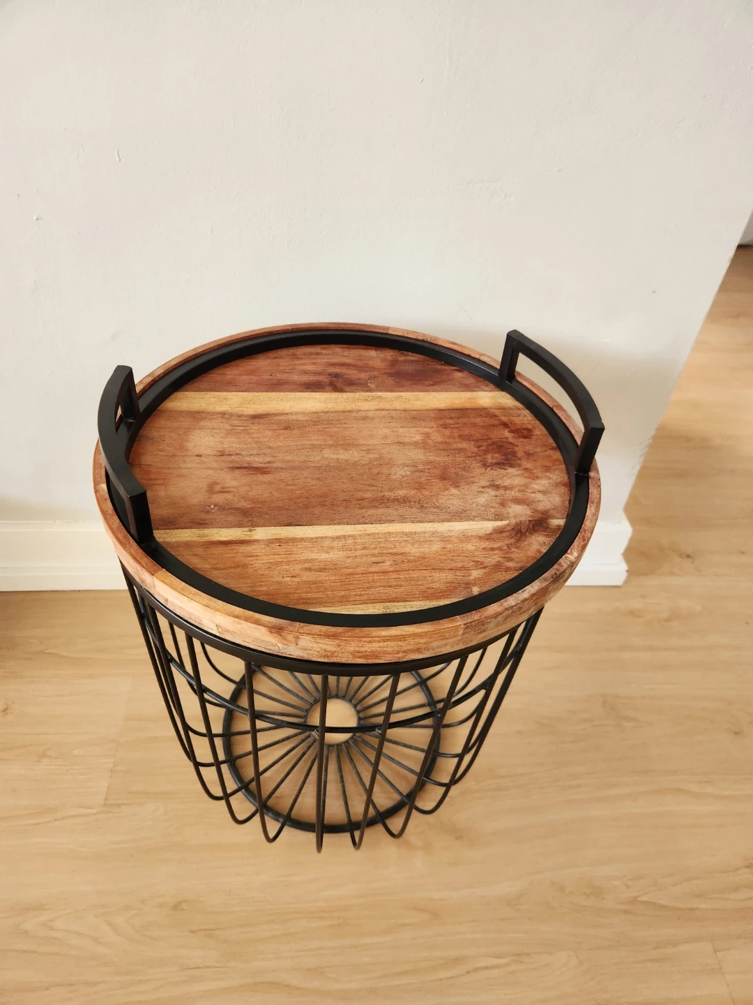 I'm selling a rustic accent table with a wooden top and metal basket base.