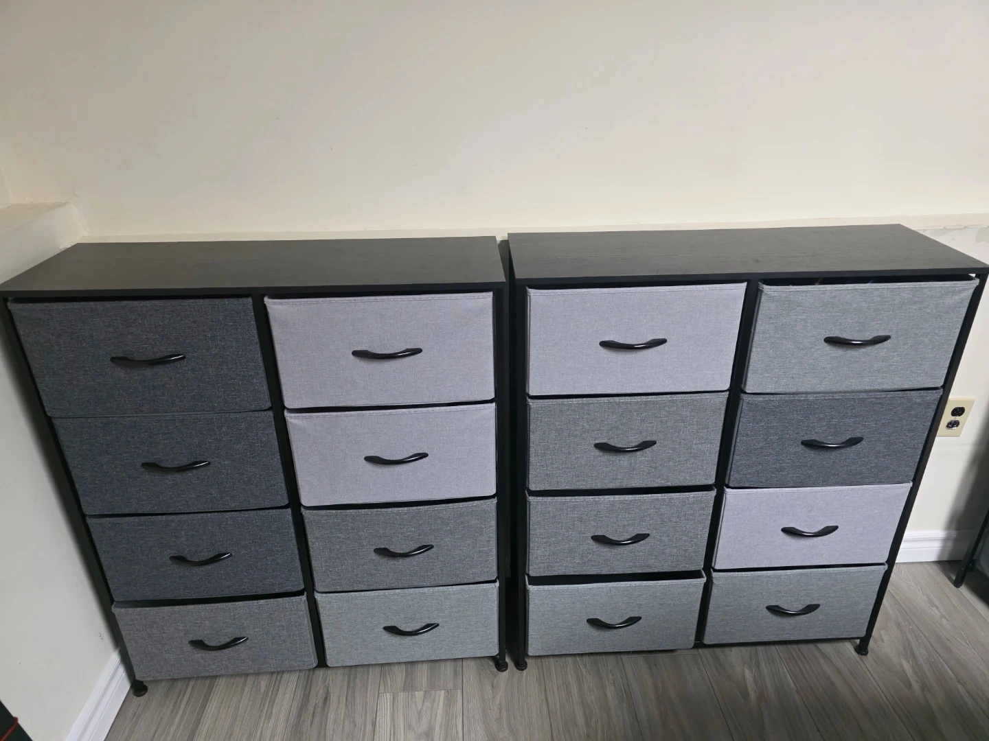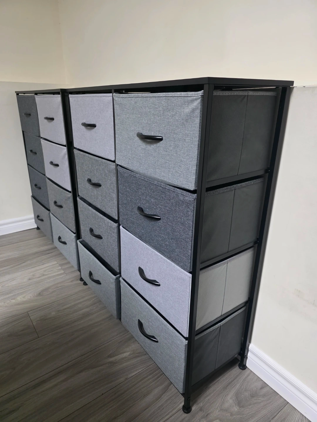 Two grey fabric drawer dressers with black metal frames. Each dresser has four drawers with black handles. Perfect for organizing clothes or linens. Provides ample storage space.