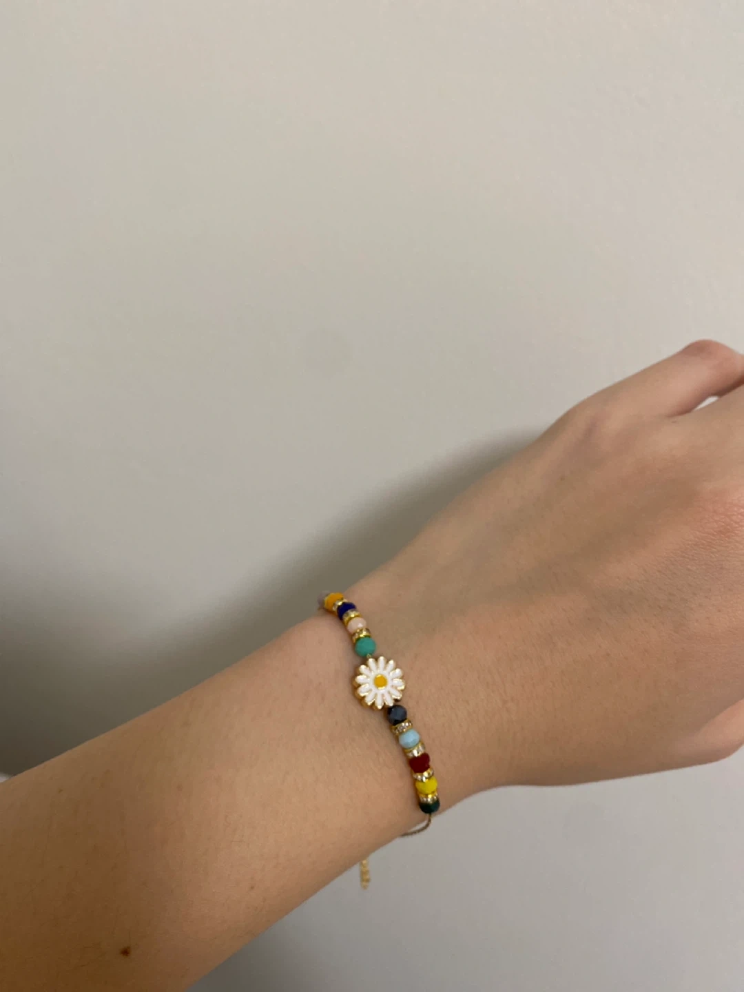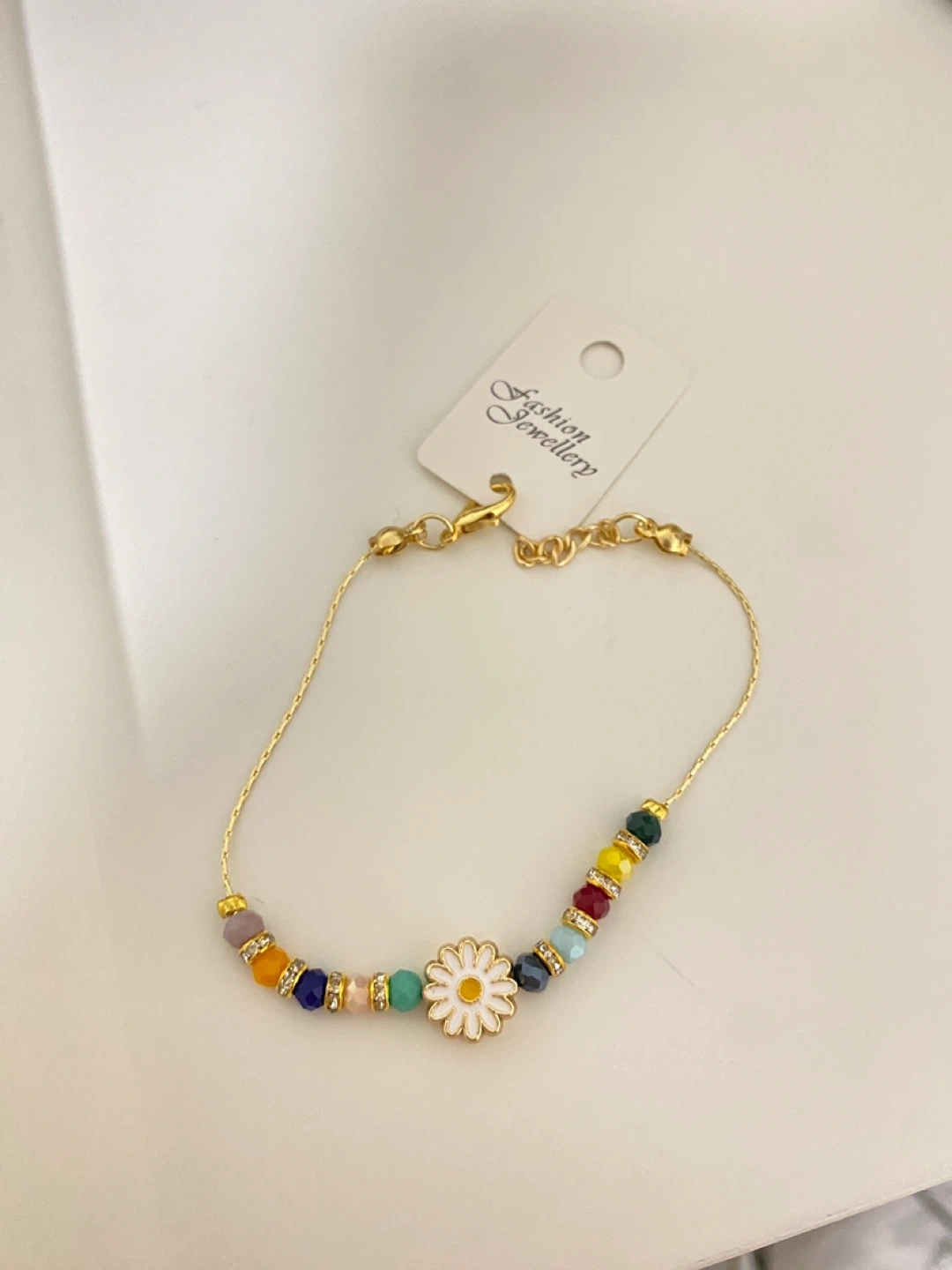 This is a colourful beaded bracelet featuring a daisy charm. It has a gold-toned chain and clasp. This bracelet adds a fun pop of colour to any outfit!
