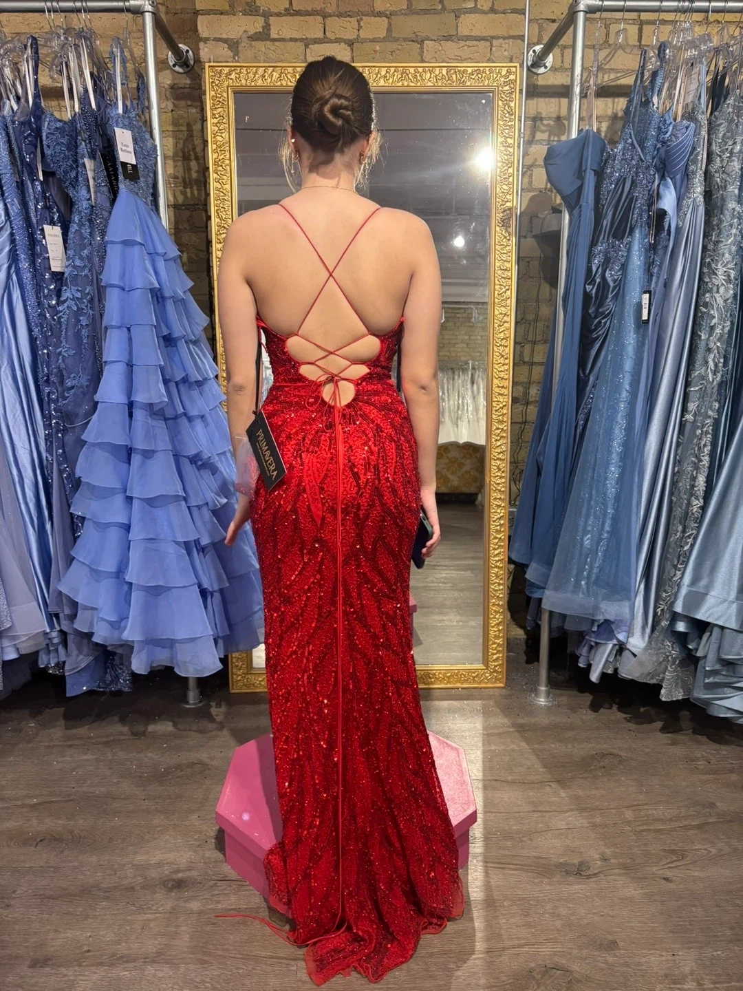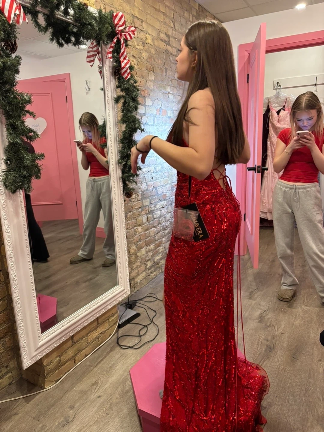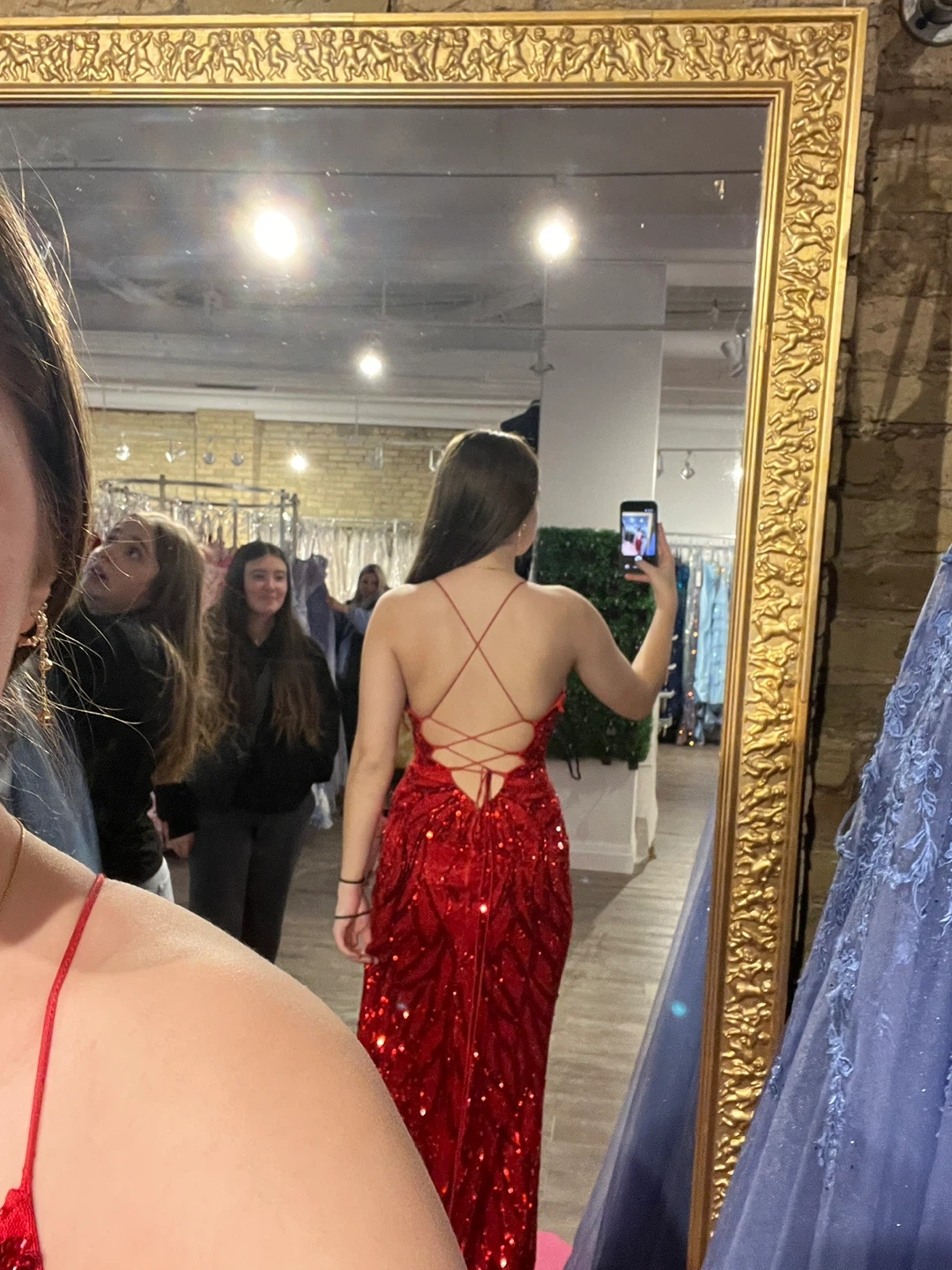 Stunning red sequin prom dress, originally $850, selling for $360. (size is 00 NO ALTERATIONS, can fit 0-possibly2) This dress features a deep V neckline, thin straps, and a fitted silhouette with a high slit, covered in beautiful sequins that sparkle in the light. It’s never been worn outside just tried on and is in excellent condition, perfect for prom or any formal event. It’s super flattering, comfortable, and got tons of compliments. I’m located in London, Ontario, message me if you’re interested or want more details!