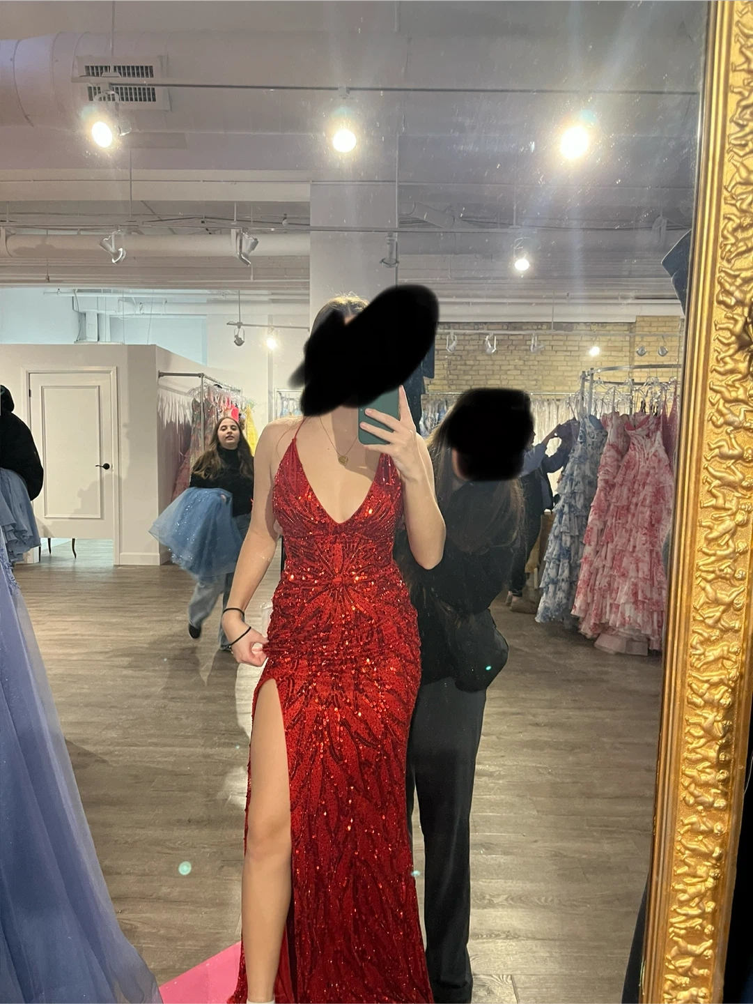 Stunning red sequin prom dress, originally $850, selling for $360. (size is 00 NO ALTERATIONS, can fit 0-possibly2) This dress features a deep V neckline, thin straps, and a fitted silhouette with a high slit, covered in beautiful sequins that sparkle in the light. It’s never been worn outside just tried on and is in excellent condition, perfect for prom or any formal event. It’s super flattering, comfortable, and got tons of compliments. I’m located in London, Ontario, message me if you’re interested or want more details!