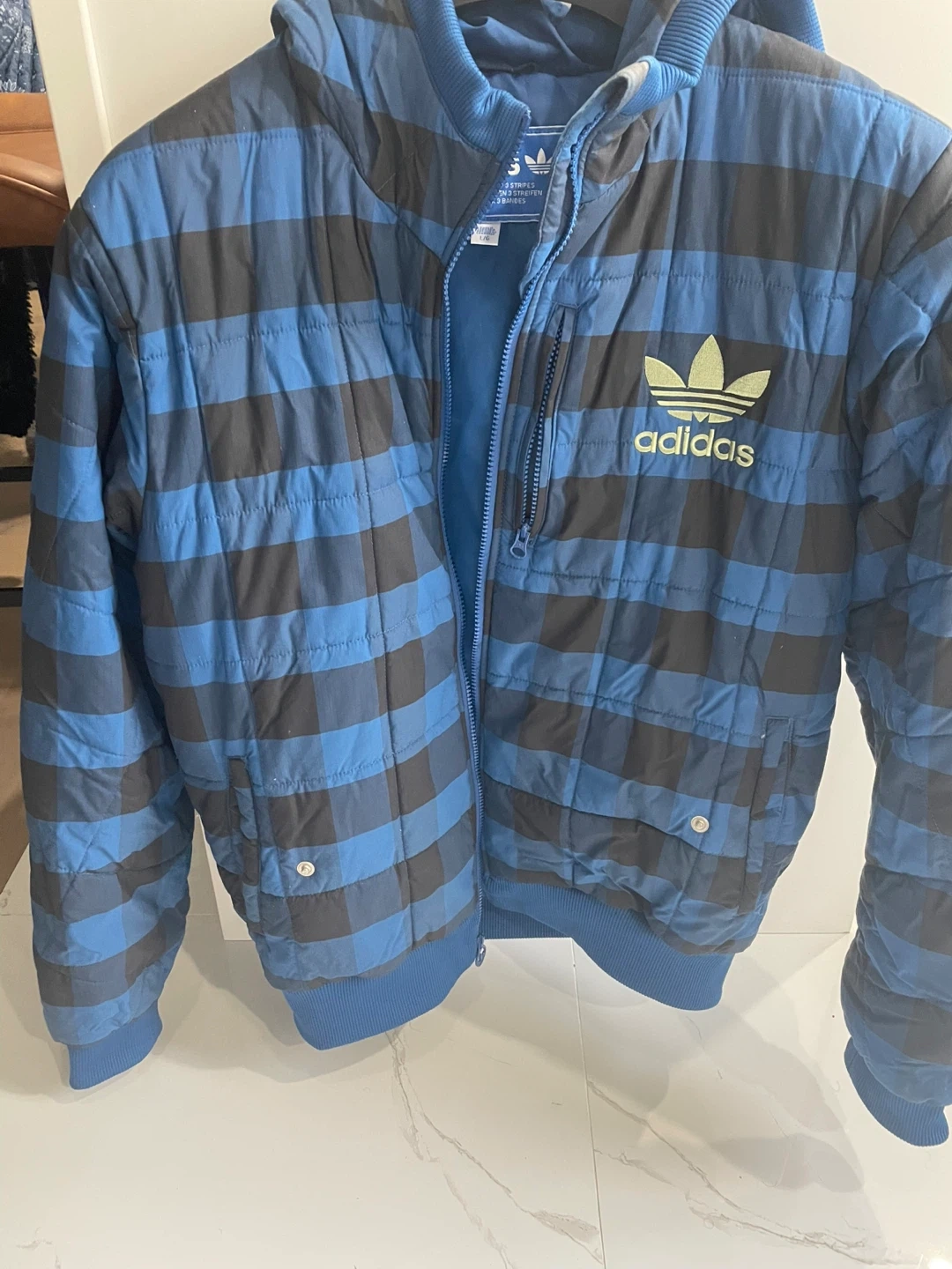 Here's a stylish Adidas puffer jacket with a cool blue and black plaid pattern! It's perfect for staying warm and looking good this season. Has the classic Adidas logo on the front. A great addition to your wardrobe! Size large