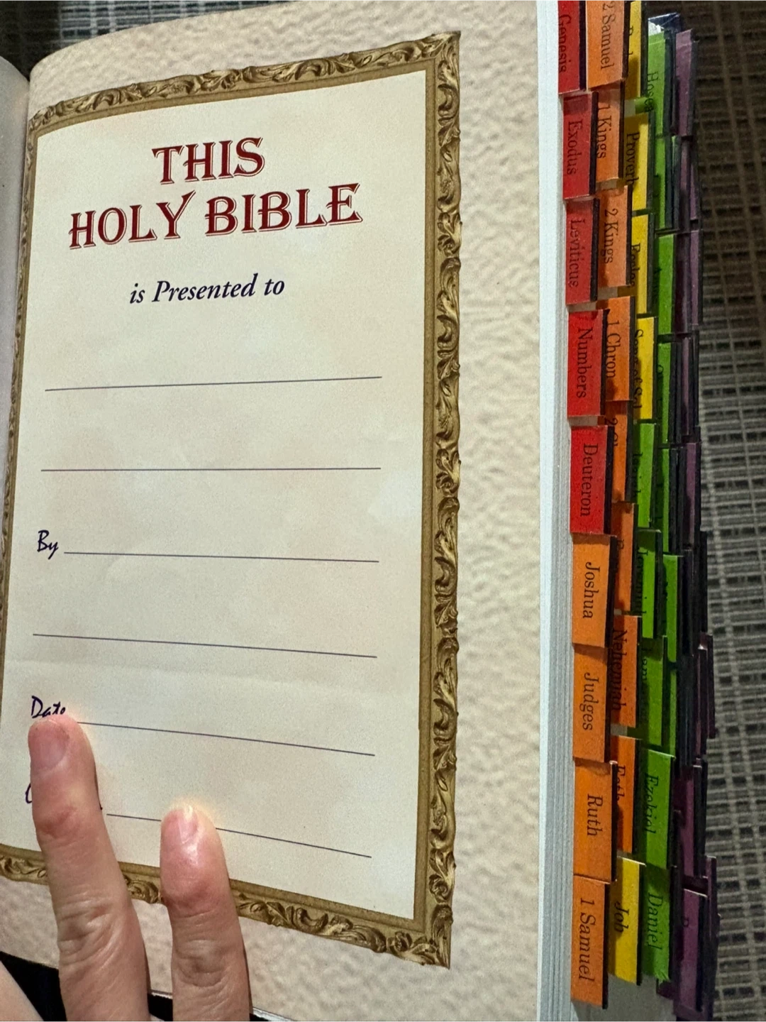 This is an Arabia language Holy Bible presented to someone. It has tabs for different books of the Bible. It also includes maps. Pickup at Morley trail NW