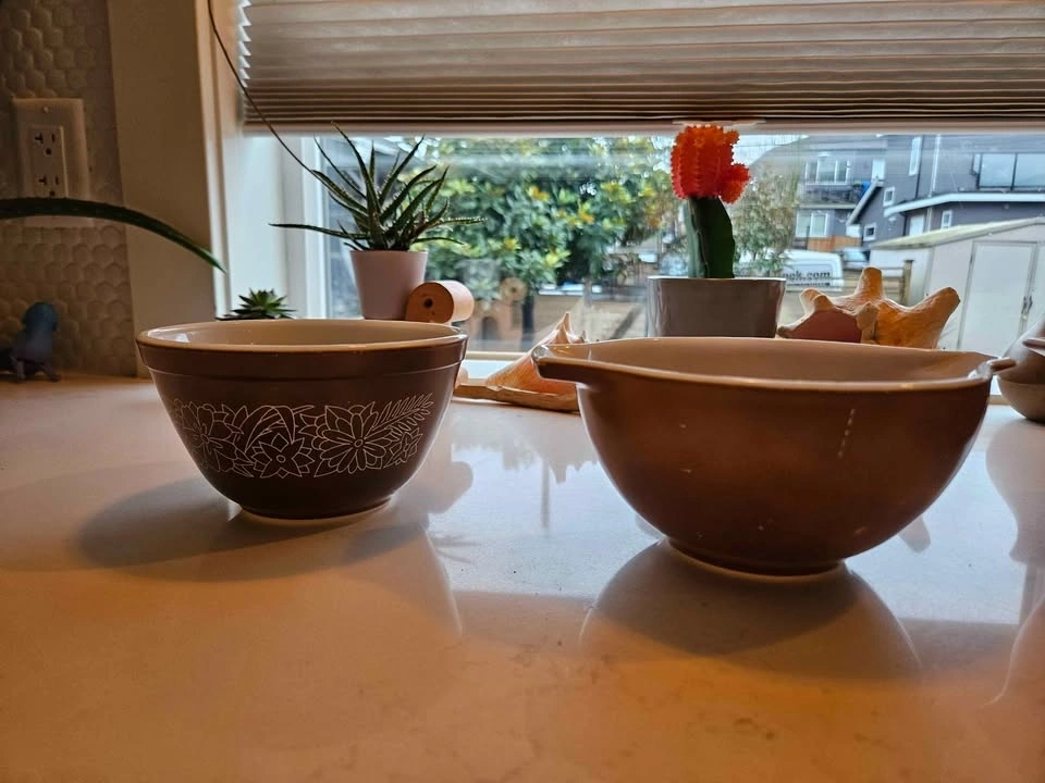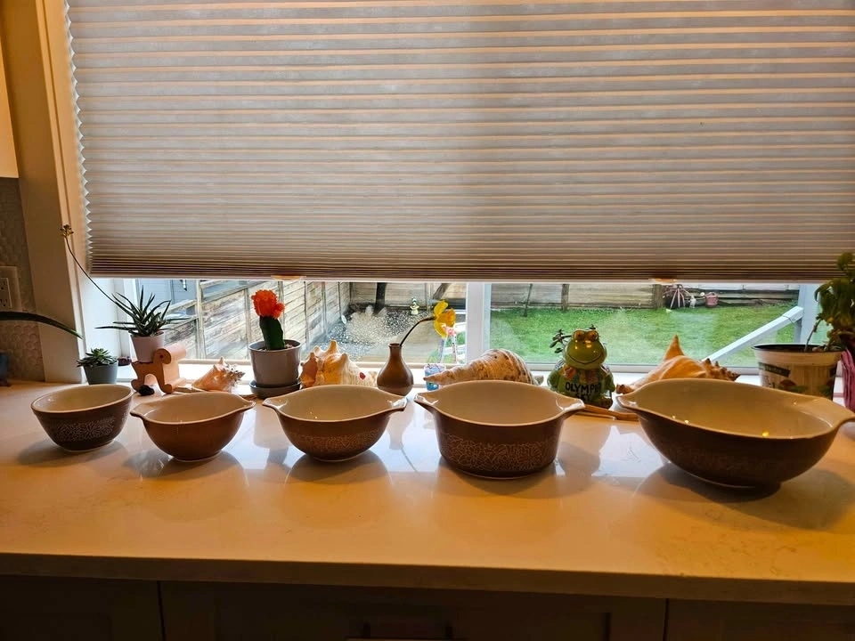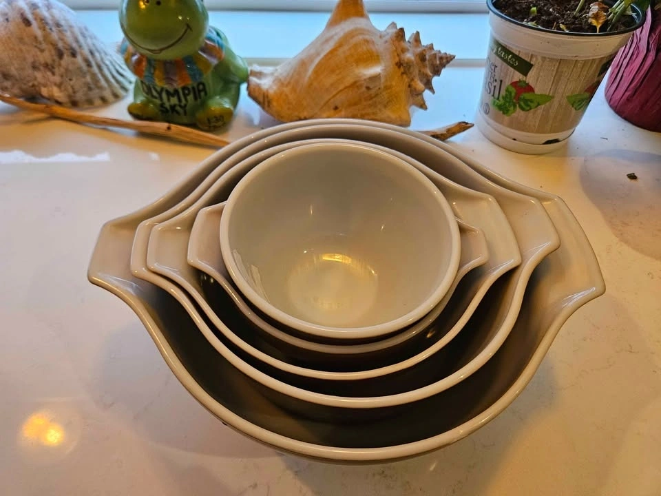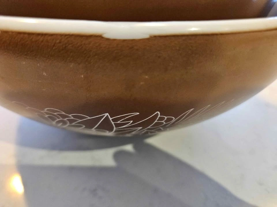 Classic vintage mixing bowls in brown with different white patterns. This set of 4 bowls is great for baking or serving. One bowl has a small chip, reflected in the price.
