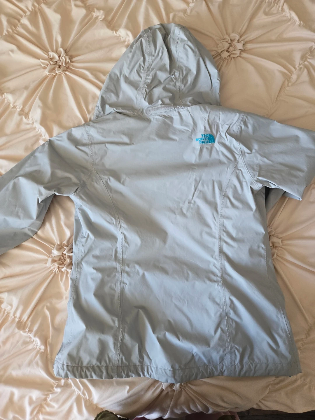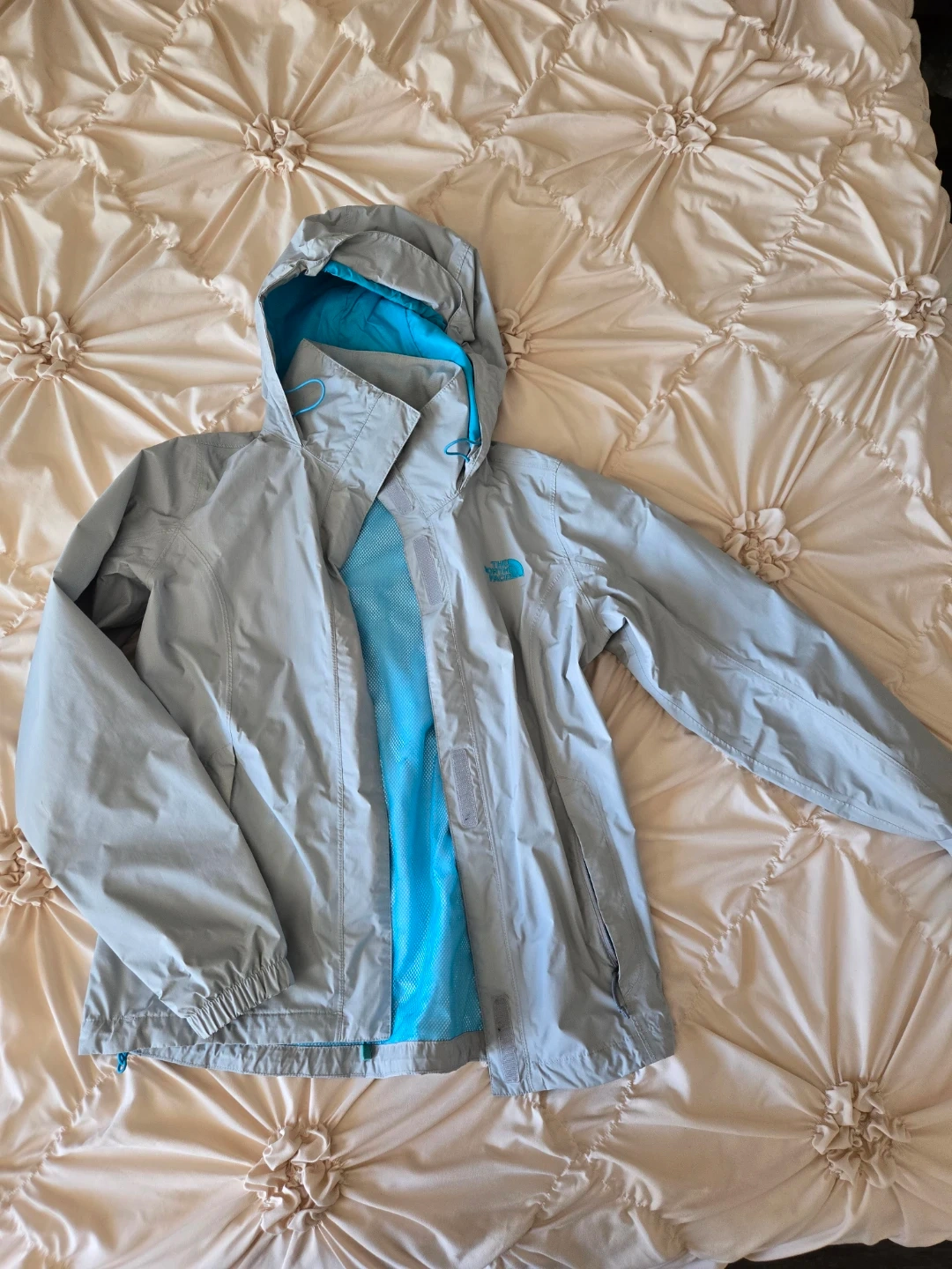 This is The North Face women's hooded rain jacket. It's made of 100% nylon shell and 100% polyester sleeve/hood lining. This jacket is a size S/P.