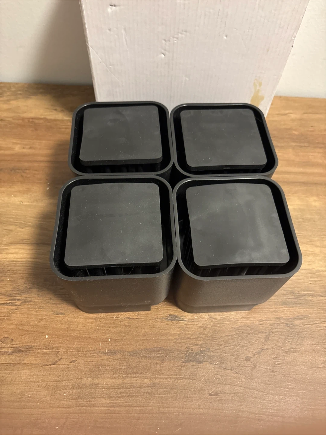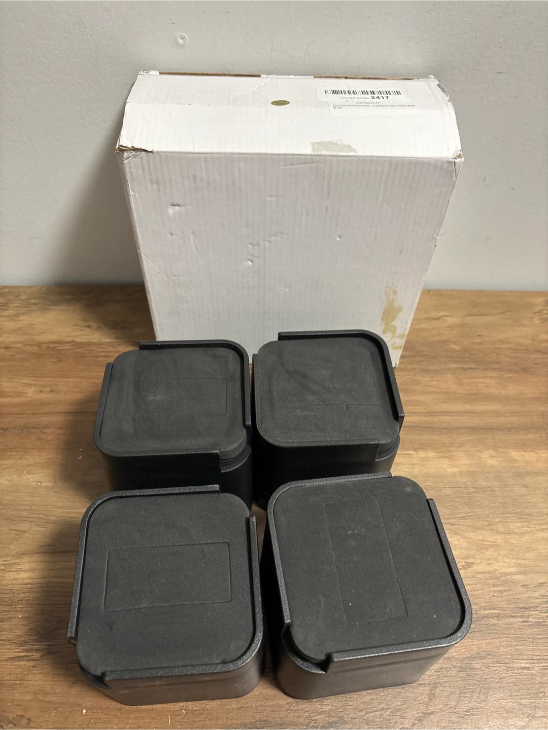 Set of four black furniture risers. These are made of durable plastic. They're designed to lift furniture for better accessibility or storage underneath.