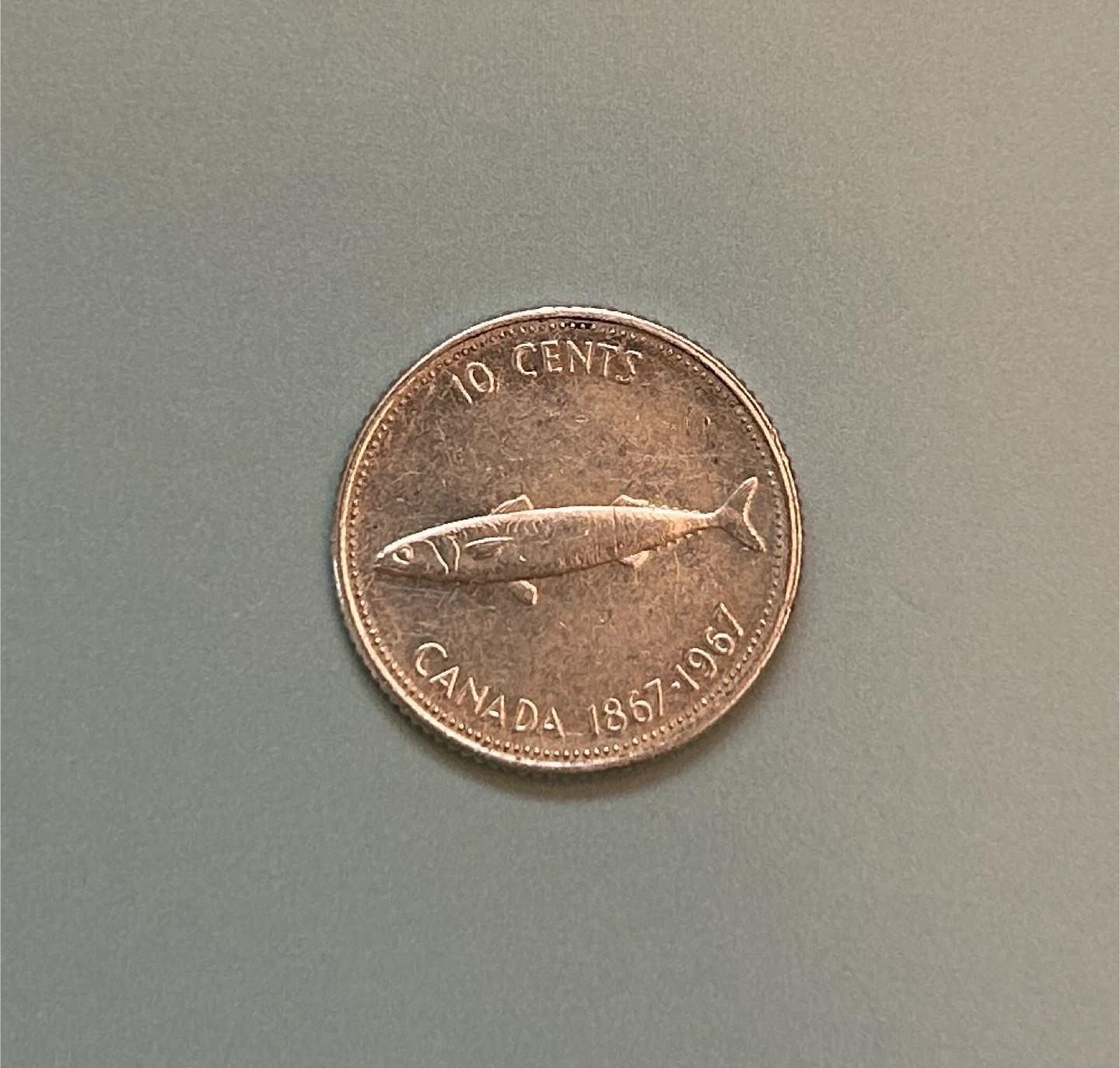 This is a 1967 Canadian ten-cent coin, featuring the anniversary dates of 1867-1967. The obverse shows Queen Elizabeth II. It's a collector's item from Canada's centennial year.