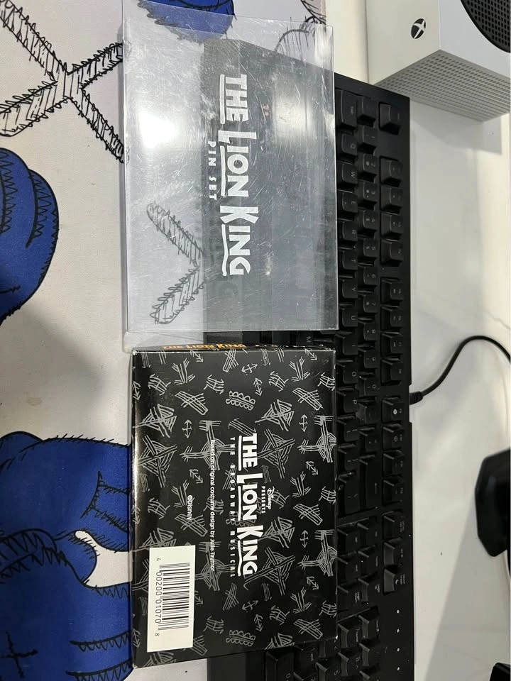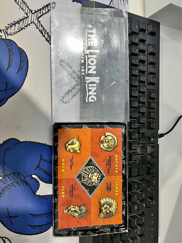Collectible Disney The Lion King pin set featuring Mufasa, Simba, Nala, Scar, and a Lion King logo pin. All pins are gold-colored and come in their original box with a clear plastic cover. The plastic cover has some scuffs and scratches.