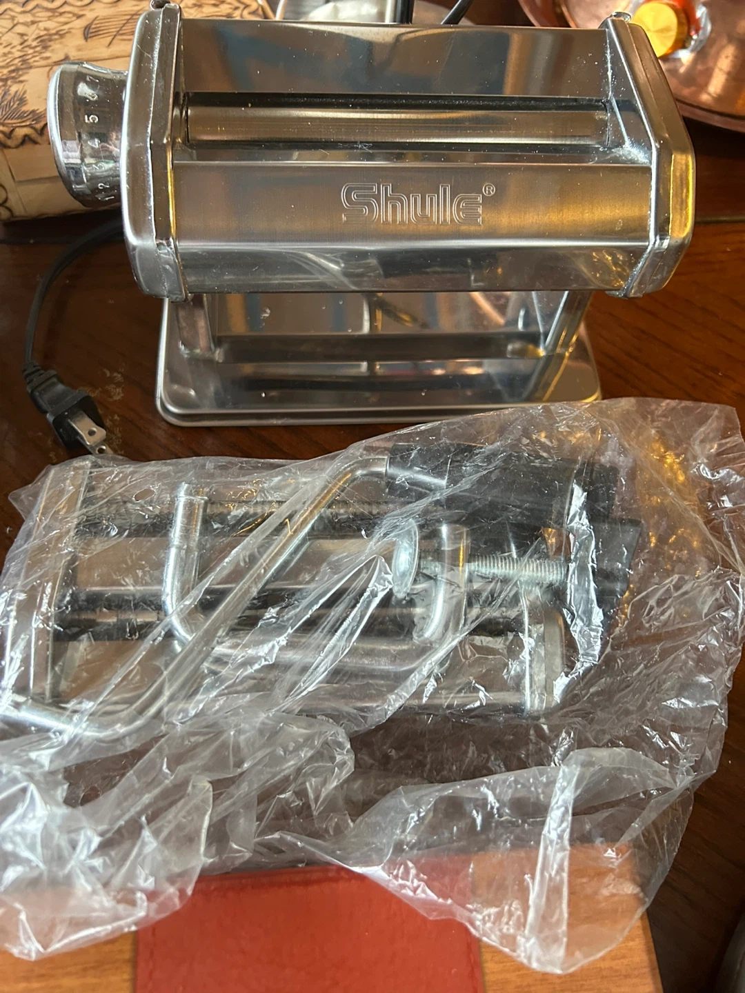 This is a Shule brand pasta maker machine, likely made of stainless steel. It comes with a clamp for securing it to a counter. Fresh pasta making is easy with this kitchen appliance!