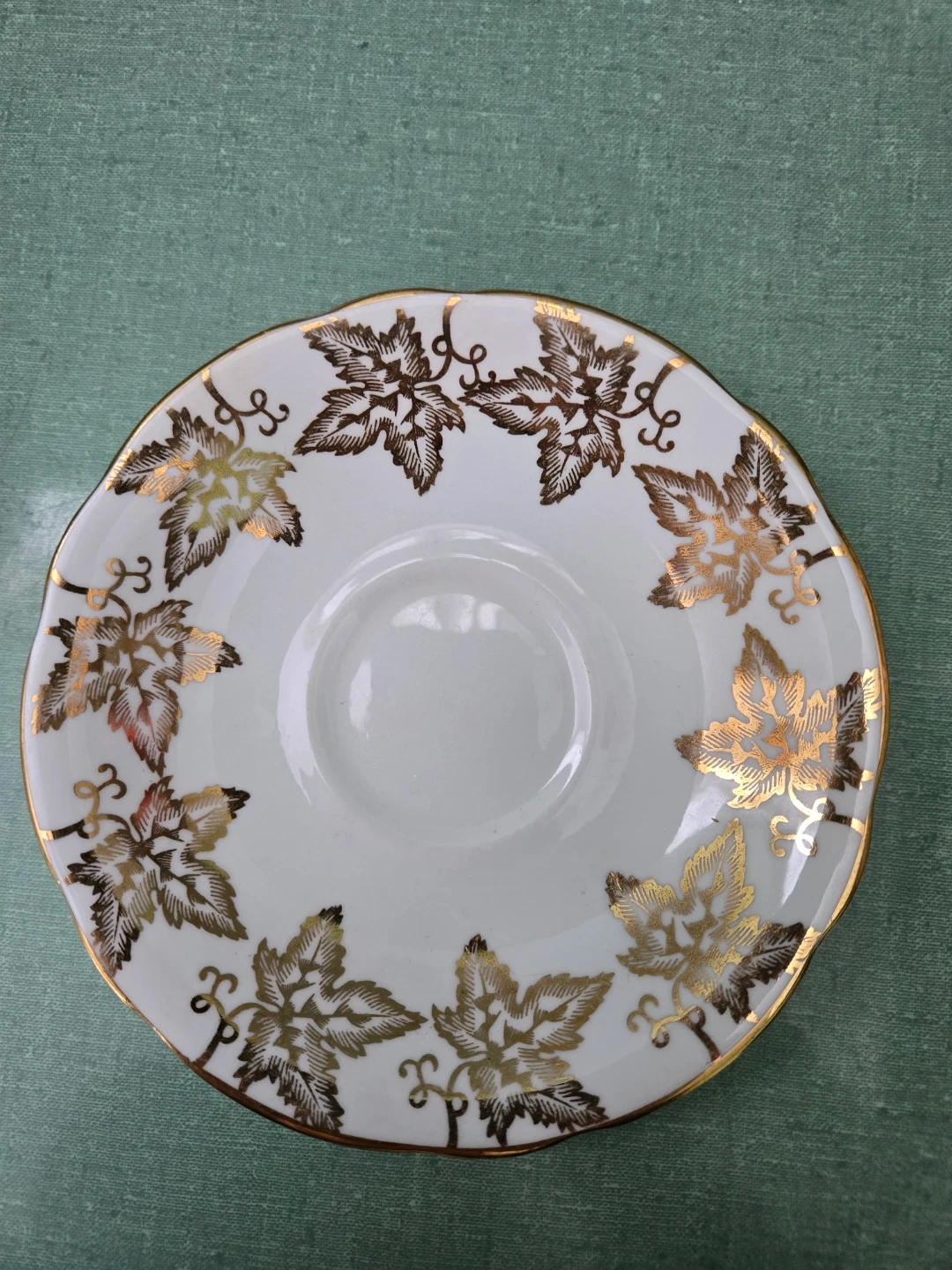 Beautiful scene of Niagara Falls on front of tea cup with surrounding gold maple leafs