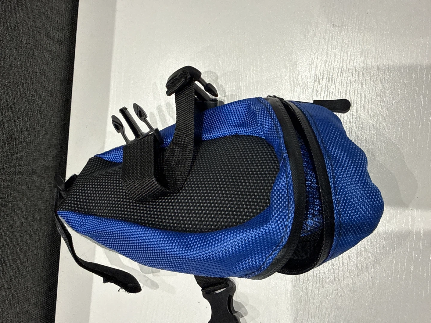 Here's a handy blue and black bike saddle bag! It's perfect for storing your essentials while you're out for a ride. The bag is brand new and never been used. Pickup location is Yonge and Steeles.